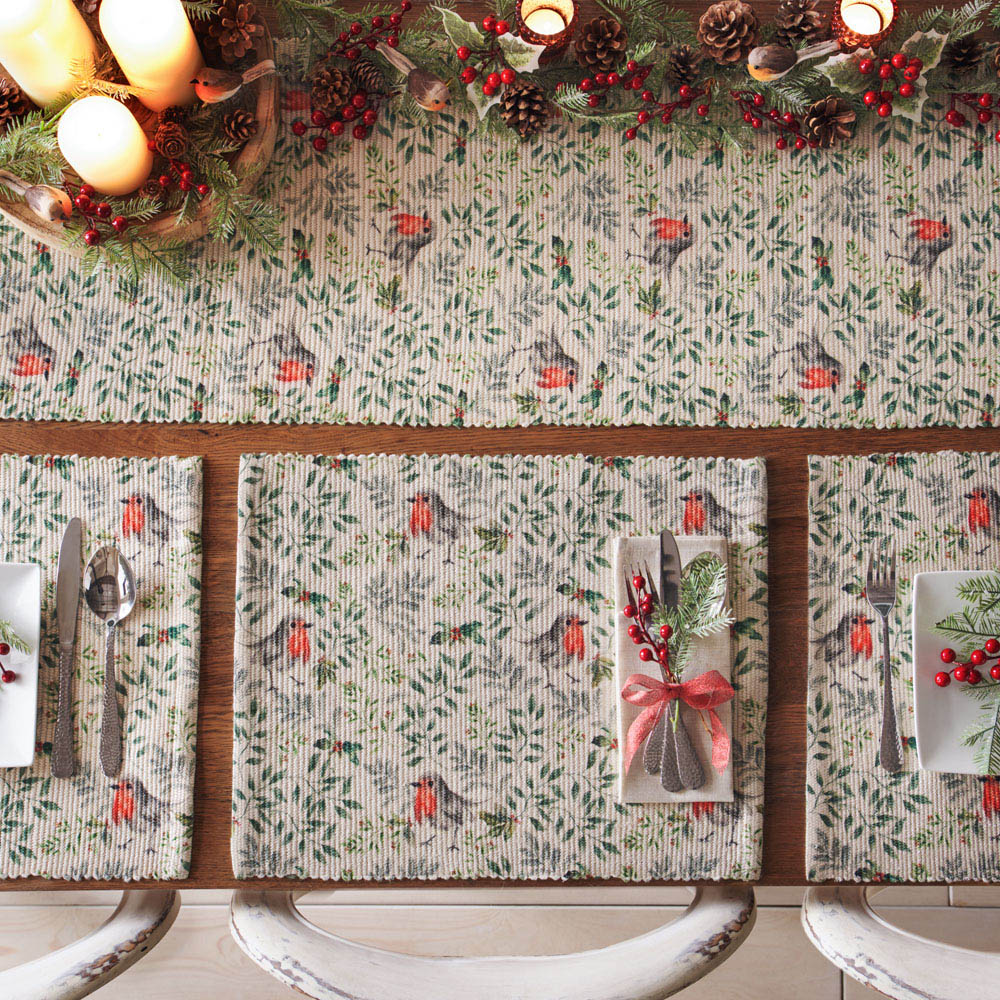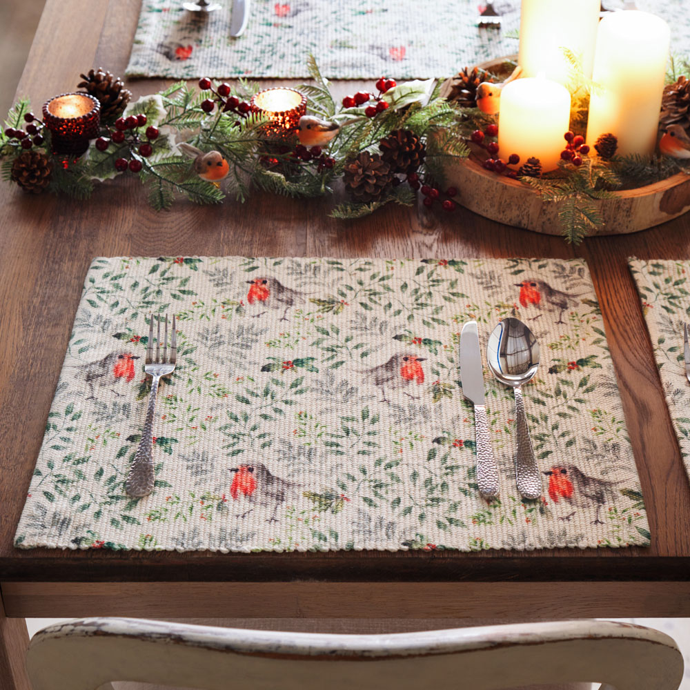 Add a touch of festive charm to your dining table with the Evans Lichfield Robin Digitally Printed Green Placemat. This set of four placemats features charming winter robins perched among holly, mistletoe, and other vivid seasonal florals. Digitally printed on durable woven polyester fabric, these beautifully designed placemats will instantly transform your Christmas dining table, bringing a delightful and festive atmosphere to your home. Size: 46 x 36cm.