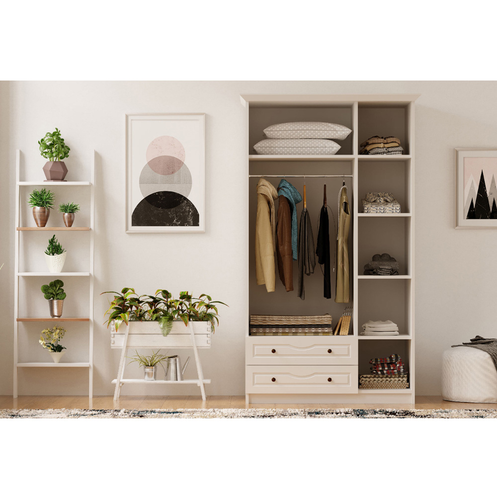 Elevate the beauty of your home interior space with the Evu CHLOE Mirrored Wardrobe. This white colour wardrobe has sleek handles and it features three exquisitely designed doors with a hanging rail section and an enclosed section with four shelves for your clothes and essentials. It also features two storage drawers for keeping all your accessories. This wardrobe is suitable for all types of contemporary and traditional interior spaces. Please note: All boxes will be sent out by the next day with a white-glove two-man service and will be delivered to your room of choice. UK Mainland: Next day or two days. Remote areas two-five days.
