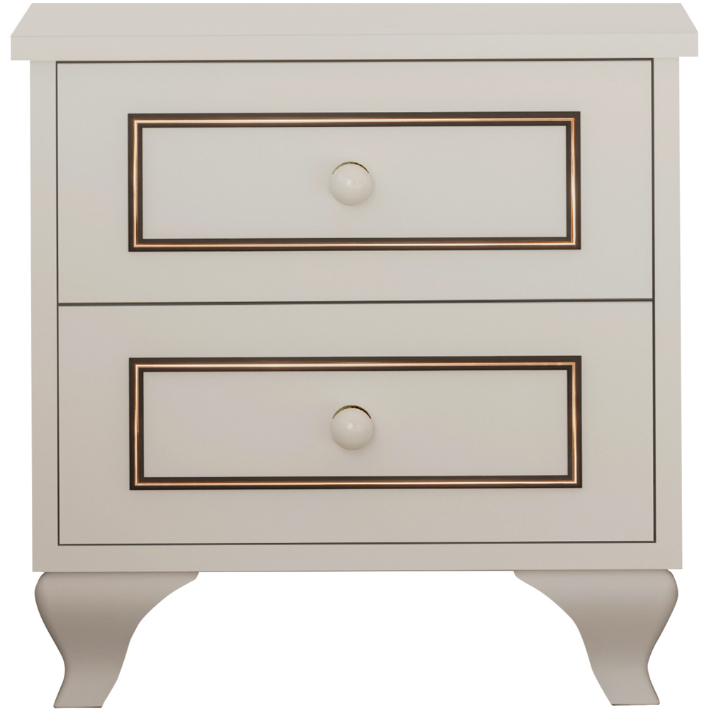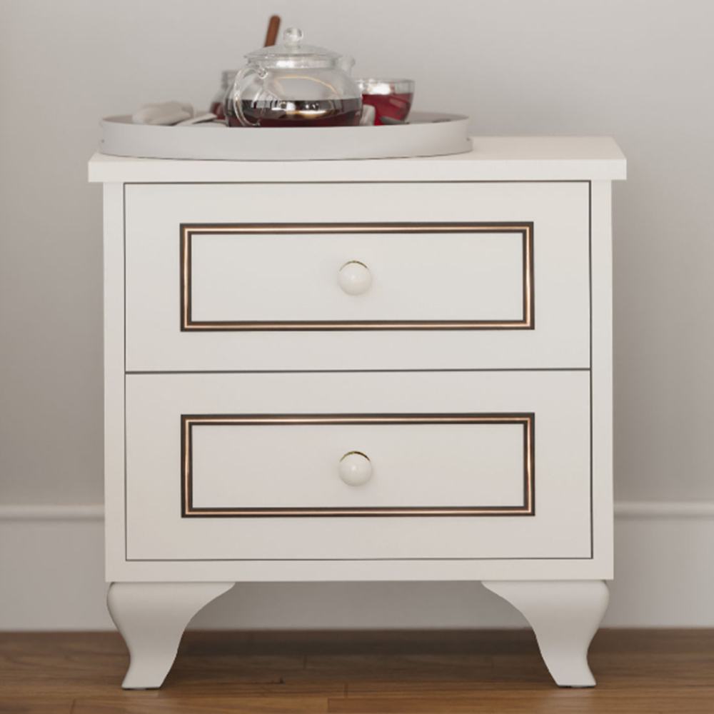 The Evu CLEMENT Bedside Table: a stylish and practical addition to any bedroom. Its sleek white finish and sturdy legs provide both stability and a clean aesthetic. The smooth tabletop is perfect for displaying your favourite items, while two convenient drawers offer ample storage for bedside essentials. Designed to complement modern and traditional interiors alike. Please note: This bedside table arrives flat-packed and requires assembly.