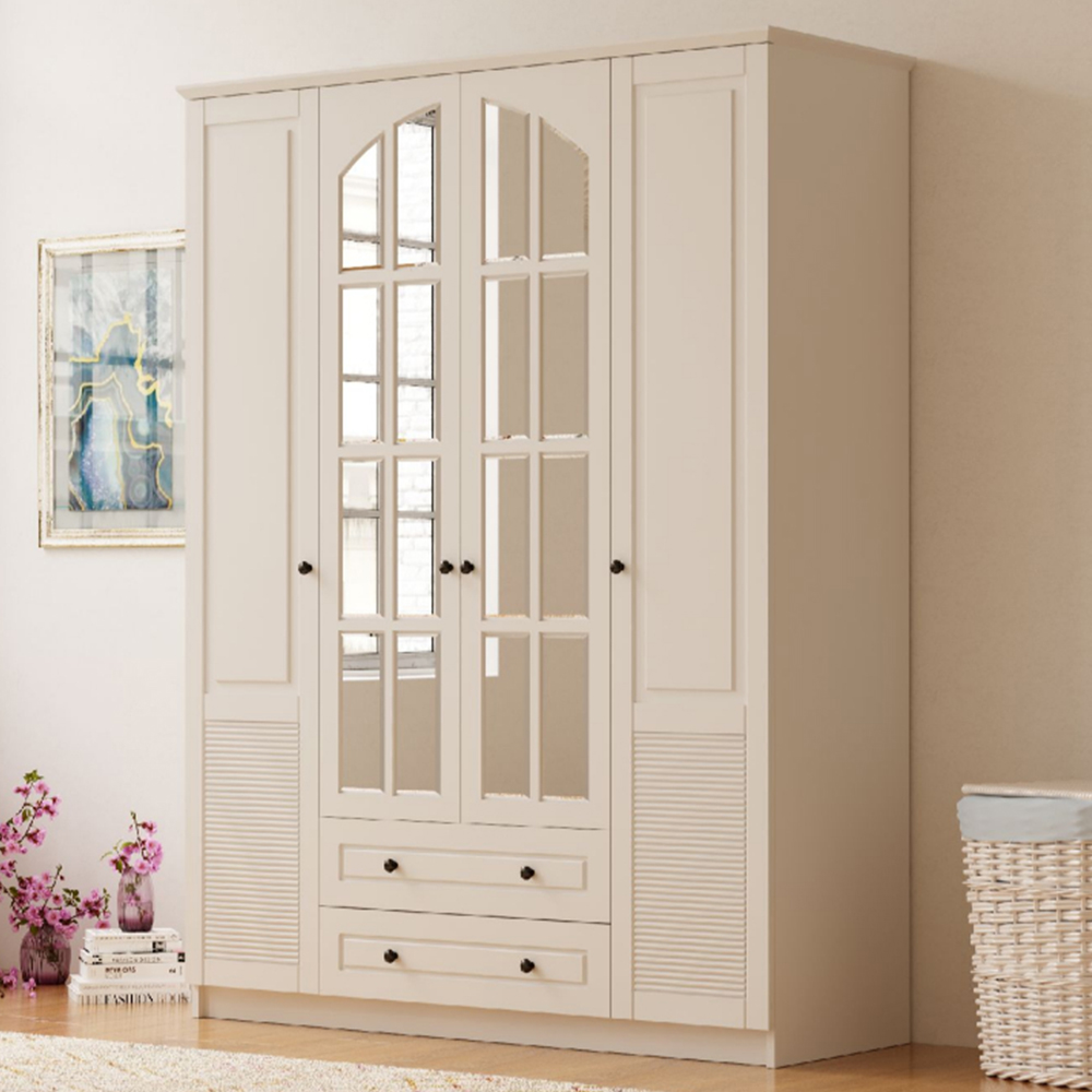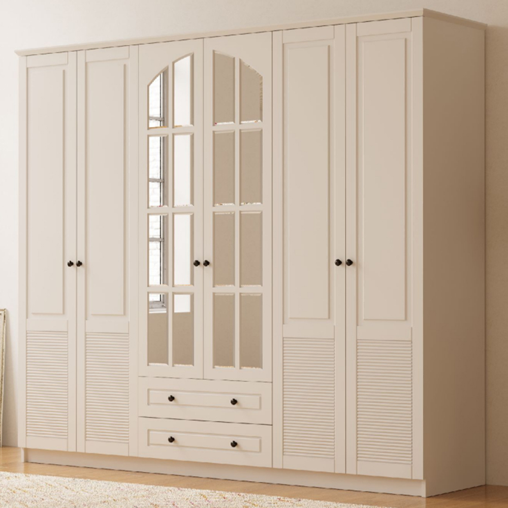 Organise your indoors with the Evu Elise 3-door 2-drawer White Mirrored Wardrobe. Featuring two drawers and three doors, this wardrobe offers ample storage space for your clothes, accessories, shoes and more. Boasting a French-inspired design, the unit is sure to blend well with a range of decor styles. Also, its classic window-style mirrored doors add style and elegance to your space. Plus, solid and durable, it is crafted with CNC techniques to make a reliable choice. Please note: All boxes are sent out with next-day or white-glove two-man service and delivered to your room of choice. UK Mainland: Next day or two days, Remote areas two to five days.