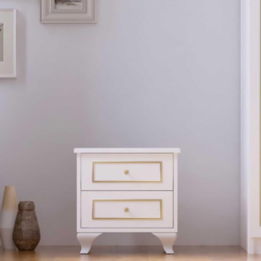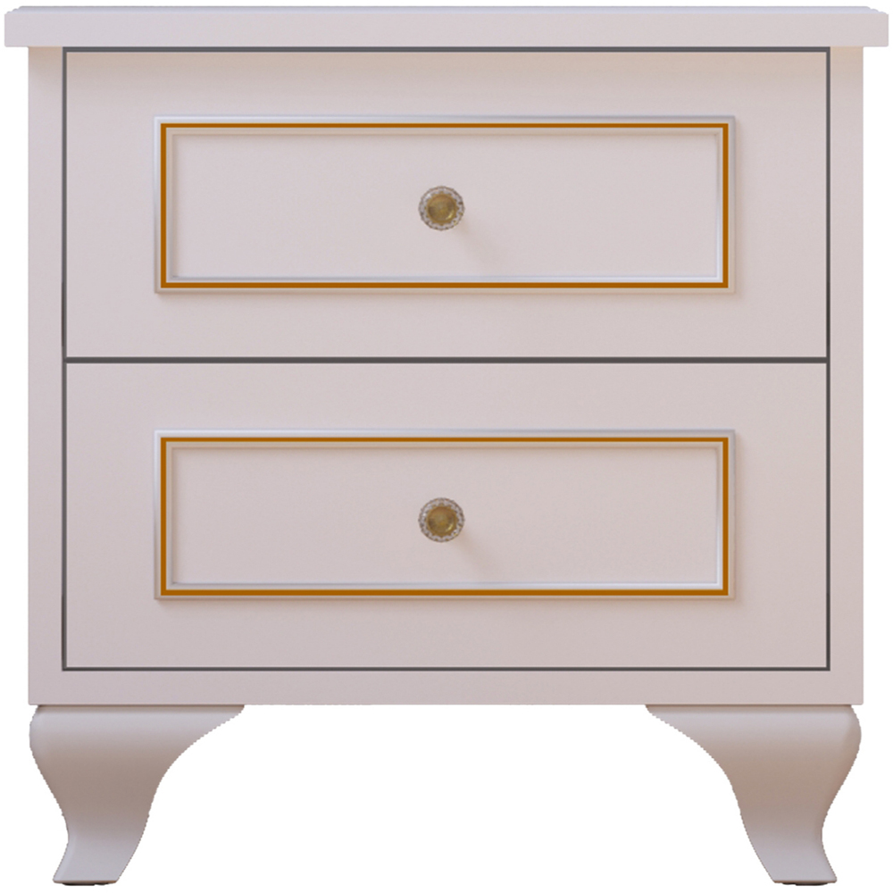 Enhance your bedroom's aesthetic and functionality with the Evu MARIE Bedside Table. Its clean white finish is accented by elegant gold detailing, complemented by sleek handles and sturdy legs ensuring stability. The smooth tabletop provides a perfect surface for your alarm clock or decorative items, while two drawers offer discreet storage for your personal belongings. This versatile bedside table seamlessly integrates into both modern and traditional interiors. Note: This item arrives flat-packed and requires assembly.