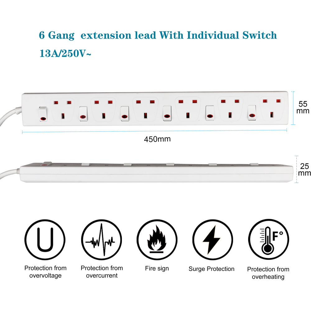 ExtraStar 13A 2m 6 Socket Child Resistant White Extension Lead with Indicate Light and Individual Switch