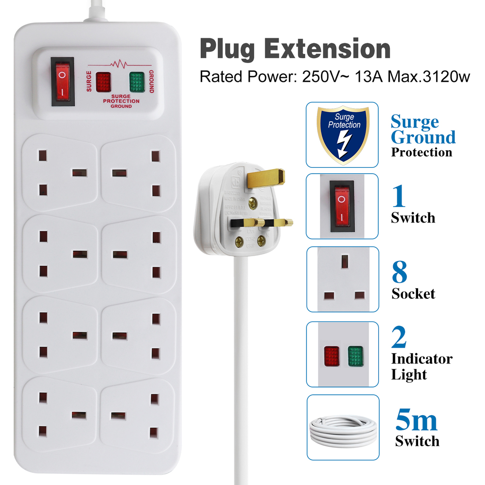Power up your home or office with this eight-socket, 13A switched extension lead. Its generous 5-metre cable provides ample reach, while the convenient single on/off switch lets you manage all connected devices at once. Built-in surge protection safeguards your electronics from power surges and voltage spikes, offering peace of mind for your valuable equipment. Clear Power & Surge LED indicators provide at-a-glance confirmation of both power and protection status. A perfect solution for safely powering multiple devices.