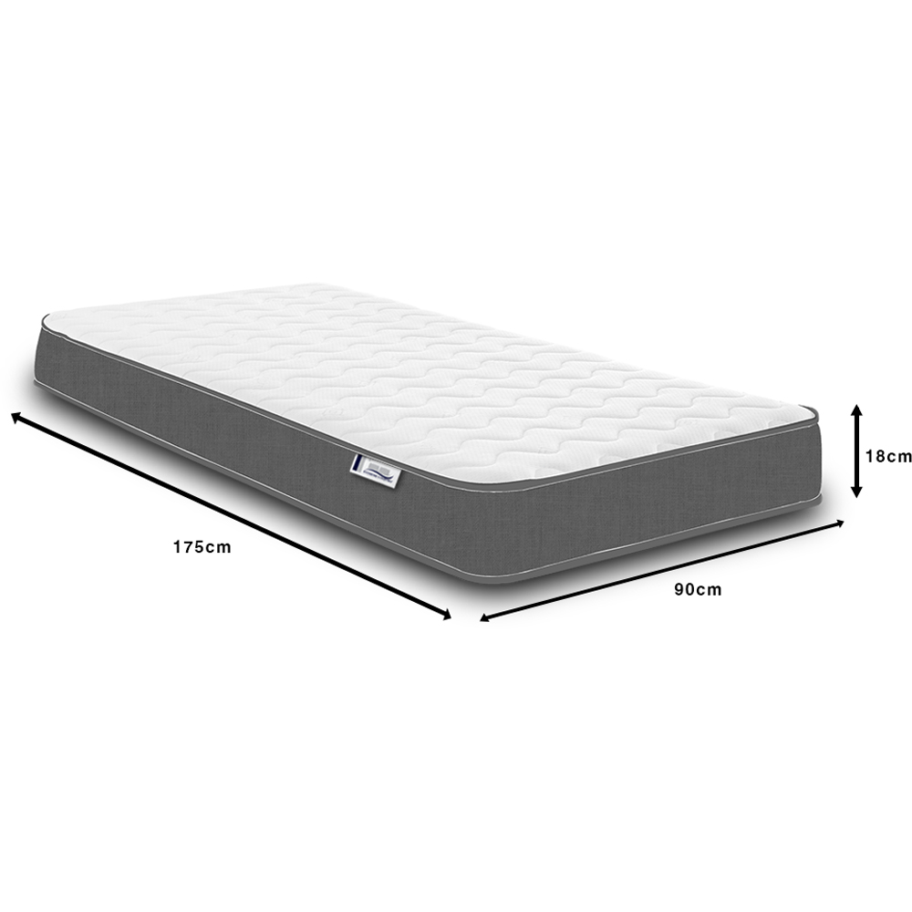 Experience ultimate comfort with the Extreme Comfort Cooltouch Colours Small Single Grey Memory Foam and Spring Mattress. Perfectly designed for kids' beds, bunk beds, spare rooms, guest beds, lofts and apartments, it’s also an excellent, low-cost option for everyday use. The Cool Touch Core top cover fabric offers luxuriously soft comfort, cosiness and is highly breathable, helping to regulate body temperature and prevent overheating while you sleep. Quilted in a different colour fabric to suit your interior colour. Handmade by experienced craftsmen at Extreme Comfort's West Yorkshire mattress factory, this mattress fully complies with all relevant UK fire safety regulations for domestic use. Sleep easy knowing you've got comfort and safety combined.