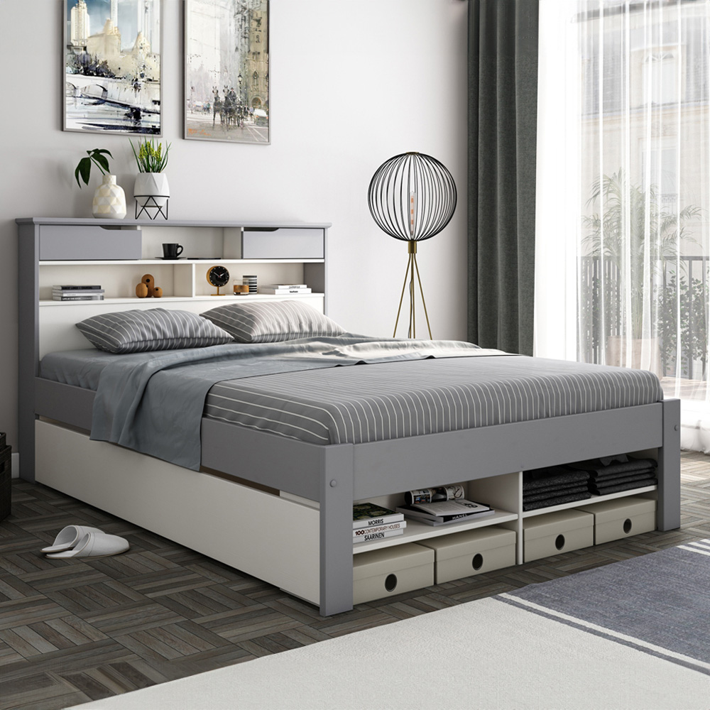 Upgrade your bedroom with the Fabio king-size bed, a charming and practical addition to any space. Its classic grey and white finish is complemented by a stylish headboard and foot end, each featuring two handy drawers perfect for storing books, blankets, and other essentials. For even more storage, a generous under-bed drawer provides ample space. The solid wooden slats offer robust mattress support. Delivered flat-packed for easy self-assembly in your chosen room. Dimensions: King size bed drawer - L204 x H24 x D70cm.