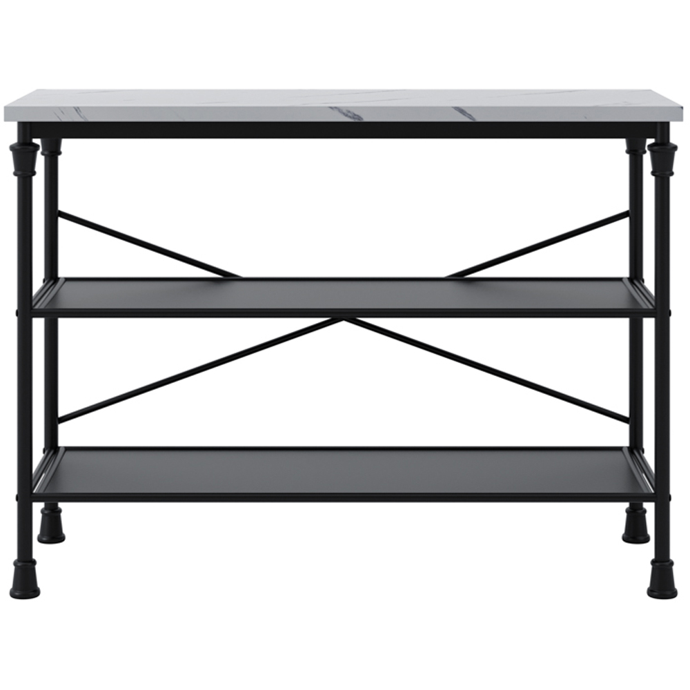 Bring a touch of elegance to your hallway or living room with the Fairmont Marble Effect Console Table. The luxurious marble-effect finish evokes a sense of opulence while being easy to clean and maintain, offering the advantages of a durable, low-maintenance surface. Supported by a sleek, black powder-coated metal frame with a distinctive X-shape design, this contemporary console table also features two shelves, providing ample storage space for your belongings. It's a sophisticated piece that flawlessly combines luxury with practicality, perfect for any contemporary home.