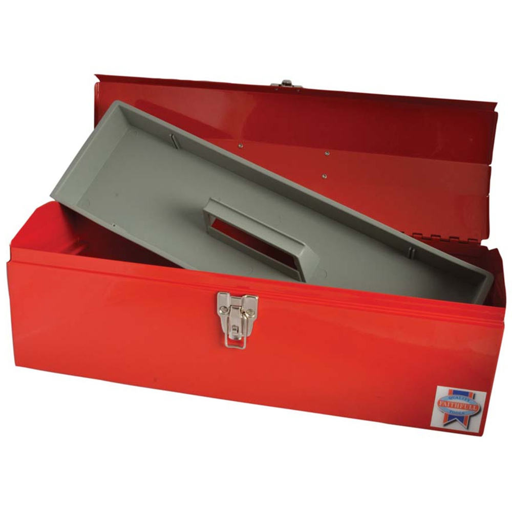 This robust, general-purpose toolbox boasts a classic barn style. Crafted from heavy-gauge sheet steel with a durable powder-coated finish, it features a strong carry handle and a clip-style lock compatible with a padlock for enhanced security. While a lift-out tray isn't included, this plain barn box design is enhanced by an additional tote tray for convenient storage.