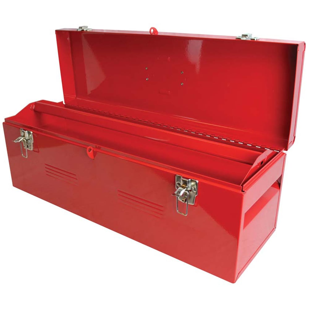 Keep your tools organised and close at hand with this heavy-duty toolbox. Perfect for the workshop, garage, or site, its robust construction ensures secure storage of both hand and power tools. Crafted from heavy-gauge steel with a hardwearing powder-coated finish, this box boasts a removable steel tote tray for smaller items. Twin metal clips and a padlock hasp provide reliable security, while a sturdy carry handle and integrated end handles make transporting even a full load effortless.