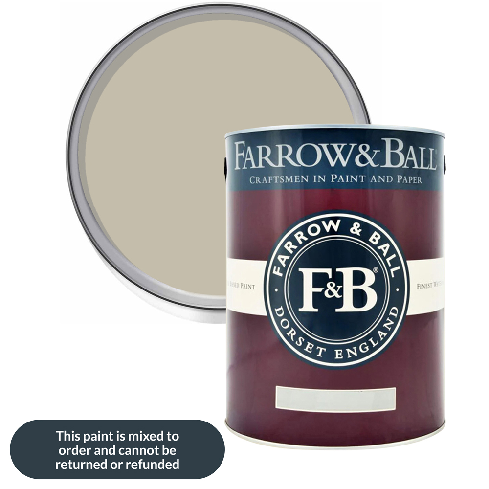 The Farrow & Ball Estate Eggshell Paint is a washable, water-based satin finish for interior wood and metal. Its soft low-shine finish brings an understated elegance to trim and furniture and is suitable for doors, kitchen cupboards, radiators, and other wood and metalwork throughout the home. Shade: Drop Cloth. Size: 2.5L.