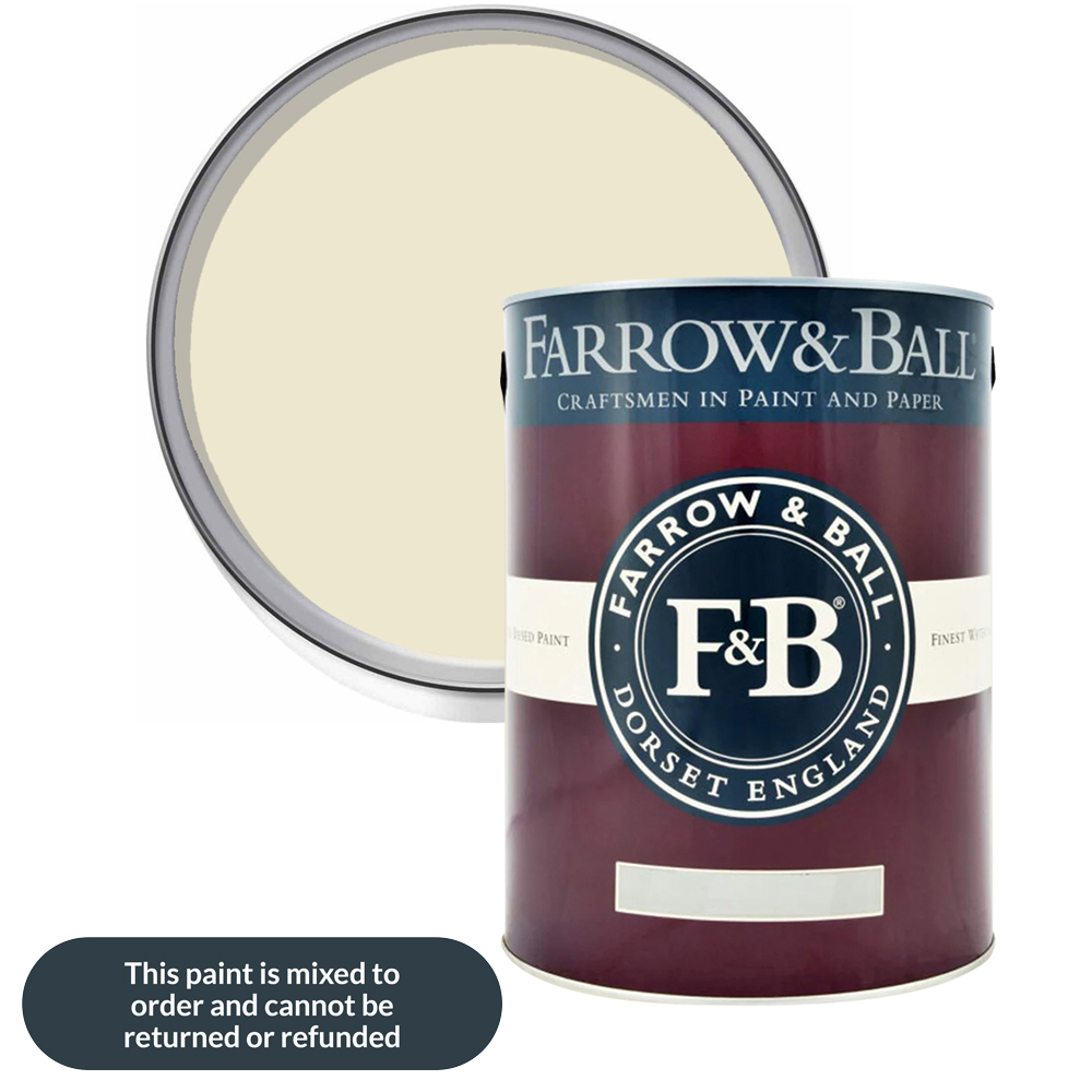 The Farrow & Ball Estate Eggshell Paint is a washable, water-based satin finish for interior wood and metal. Its soft low-shine finish brings an understated elegance to trim and furniture and is suitable for doors, kitchen cupboards, radiators, and other wood and metalwork throughout the home. Shade: New White. Size: 5L.