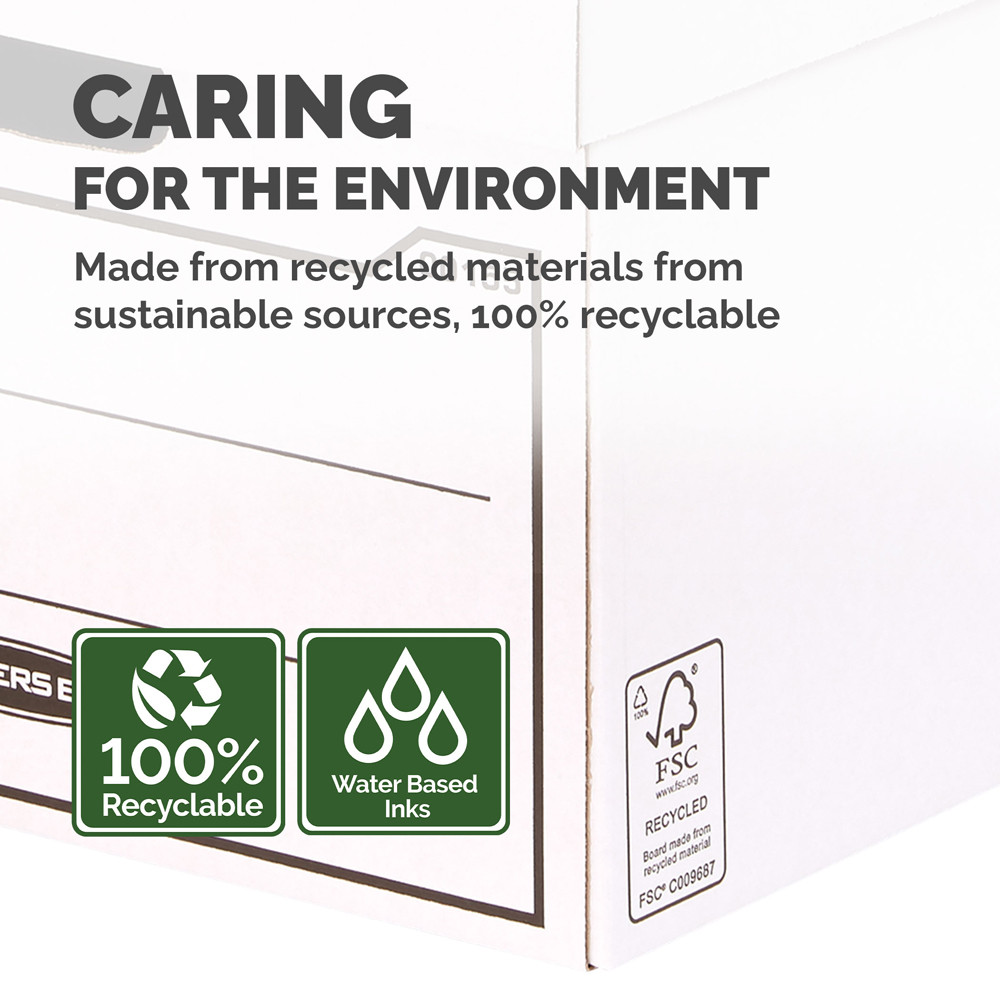 Streamline your storage with this 10-pack of white cardboard boxes. Perfect for home or office, these durable boxes offer easy assembly and a convenient lift-off lid to keep contents clean and protected. Made from FSC-certified, fully recyclable board with water-based inks and solvent-free adhesives, these eco-friendly boxes are built to last. Stackable up to two high, and featuring handy cut-out handles for effortless transport. Internal dimensions: H25 x W32 x D39cm.