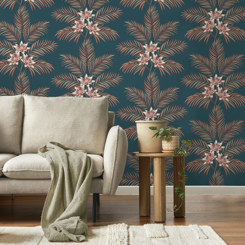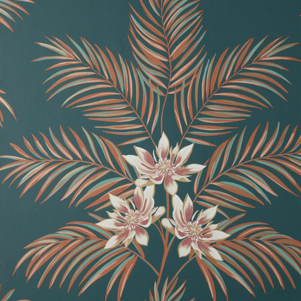 Escape to paradise with Fine Decor Bali Tropical Floral Peacock Wallpaper. Hand-painted flowers nestled amongst palm leaves create a lush tropical scene. Brushed metallic highlights shimmer against a matte background, adding depth and sophistication. This easy-to-hang wallpaper makes a striking statement in any room.