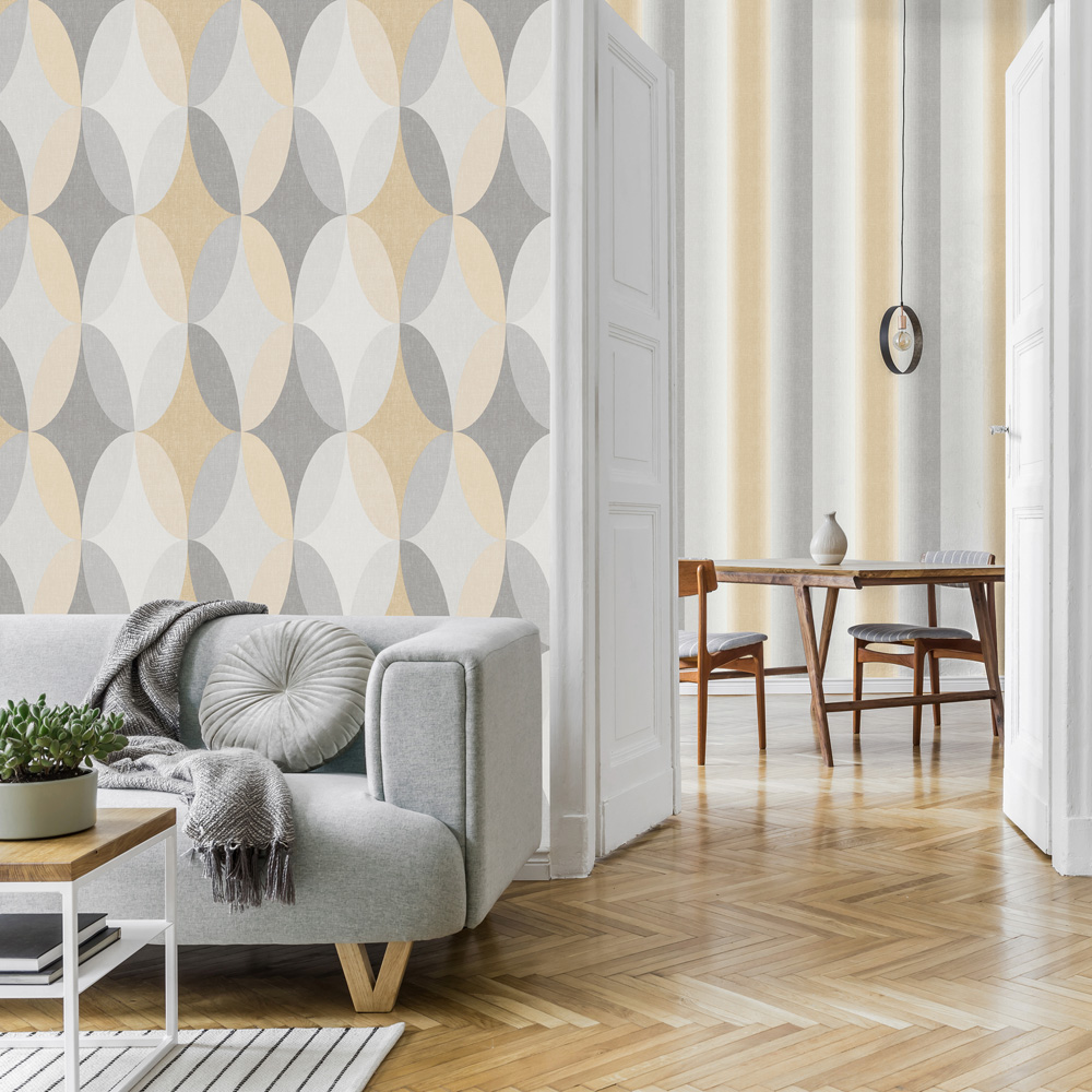 Fine Decor Kirby Oval Geo Mustard Wallpaper adds sophistication and luxury with its neat geometric design. Overlapping ovals in mustard and grey create depth, while the soft colour palette offers a retro feel and brightens your living space with hints of sunny mustard.