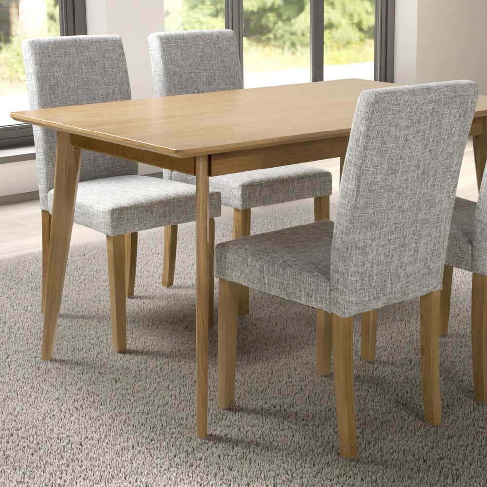 Introduce a touch of elegance and comfort to your dining area with this pair of Finley Linen Effect Weave Dining Chairs. These stylish, versatile chairs are upholstered in a hard-wearing grey linen effect fabric and supported by sturdy natural rubberwood legs, resulting in a contemporary aesthetic. Designed with a gently curved backrest, these chairs ensure a comfortable seating experience. Simple self-assembly is required.