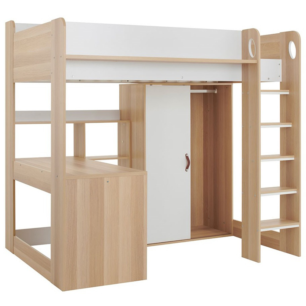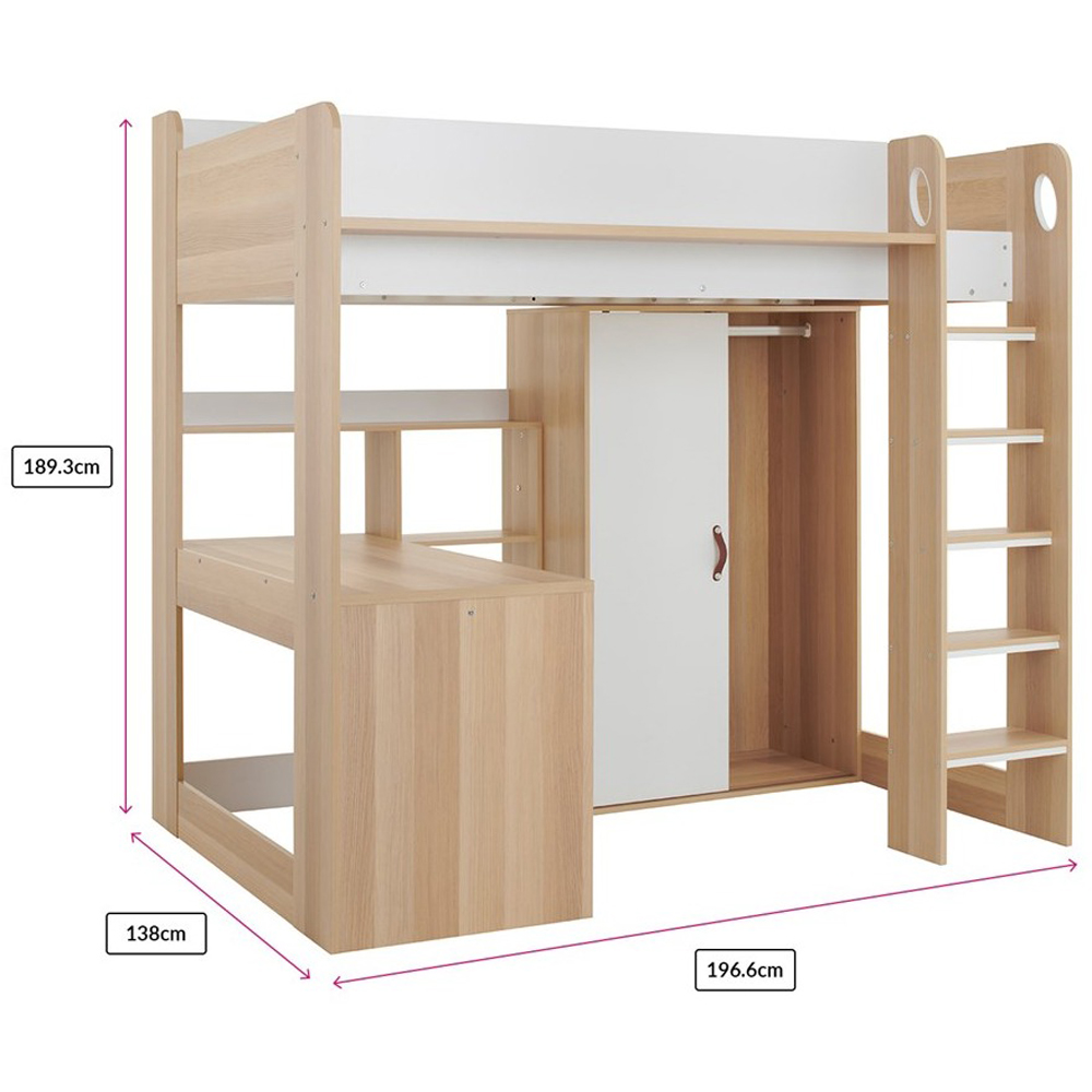 The high sleeper configuration cleverly incorporates a desk, wardrobe, and shelving, freeing up valuable floor space for play and creativity. Say goodbye to clutter with the integrated shelving, which surrounds the desk and runs along the sides and bottom of the bed, offering a dedicated place for books, toys, clothes, and cherished keepsakes.