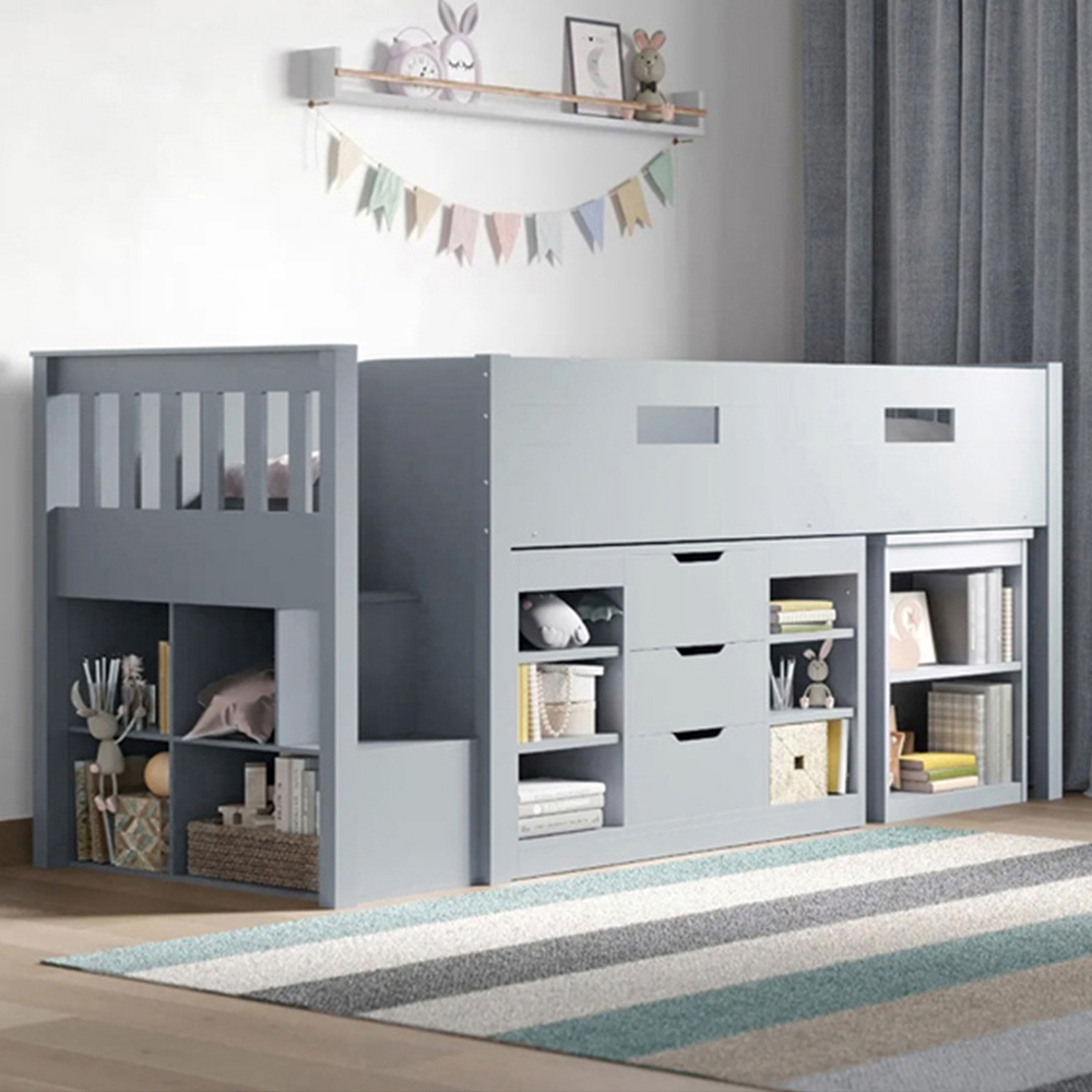 The Flair Charlie white wooden cabin bed is a carefully designed mid-sleeper, created to meet the needs of both parents and children. Constructed from solid, sturdy particle board, the frame features a staircase designed for easy and safe access to the sleeping area. Wide, deep steps ensure excellent foot stability and add to the bed frame's modern, unique design. The bed offers a practical storage solution, consisting of built-in shelving compartments, a chest of three spacious drawers, and a pull-out desk, making it a fantastic space saver for children's bedrooms. Note: The Charlie mid-sleeper requires a standard UK single mattress (90x190cm). For safety reasons, the mattress should not exceed 16cm in depth.
