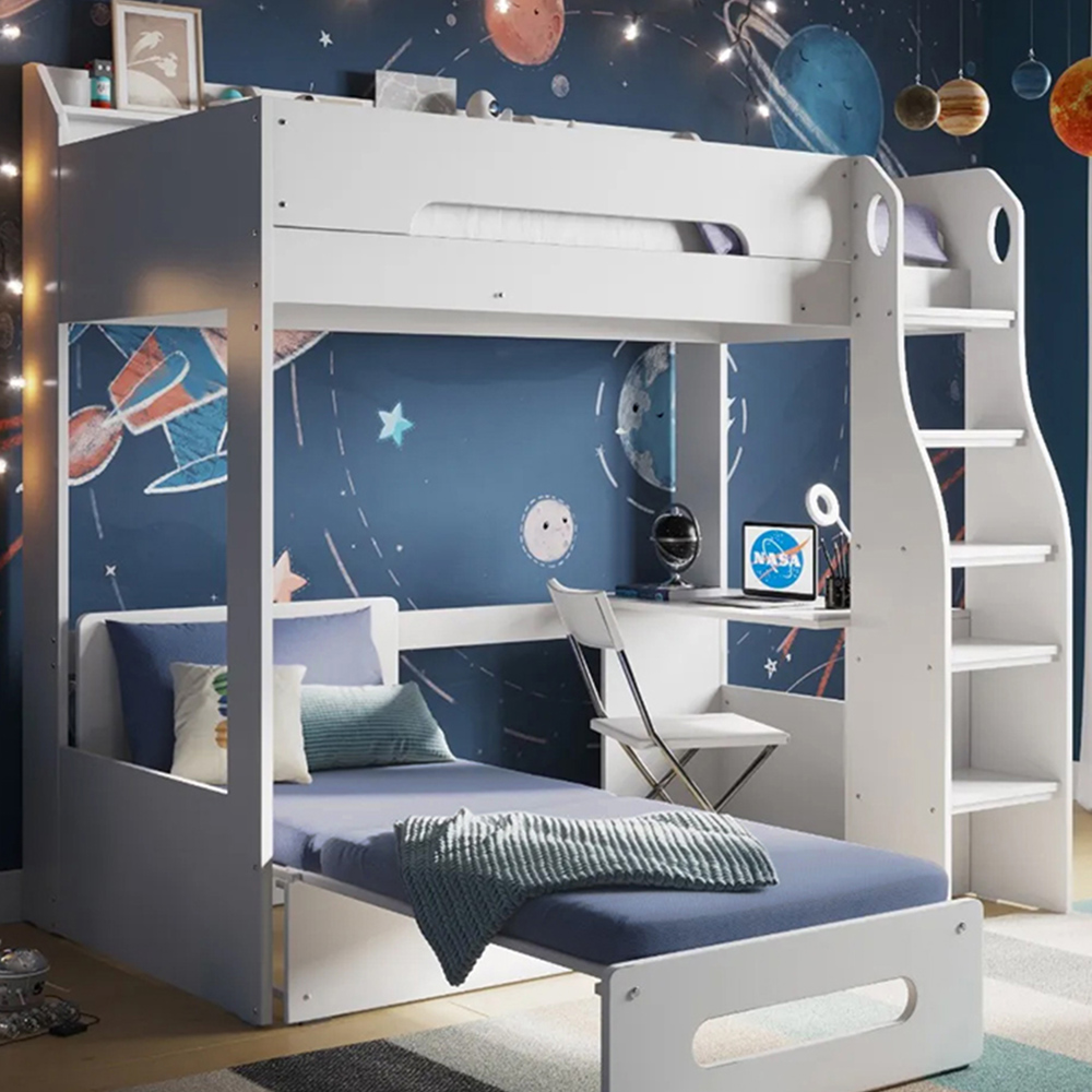 Maximise your bedroom space with the Cosmic White Wooden High Sleeper, complete with a charcoal grey futon. Crafted from robust particle board, this high sleeper offers a fusion of contemporary style and clever functionality. Designed to optimise your living area or bedroom, this innovative bed features a versatile futon that easily transforms from a comfortable seating area into an extra bed for guests, offering a seamless day-to-night solution.