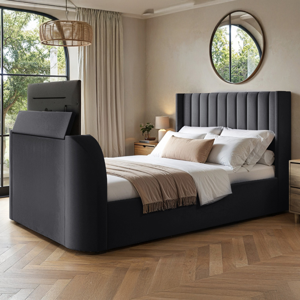 Introduce a touch of luxury to your bedroom with the Fallon TV Side Lift Ottoman Bed. Beautifully crafted with elegant charcoal velvet upholstery, this bed combines plush comfort with clever design. Featuring a smooth, side-lift hydraulic ottoman, it provides generous hidden storage, while the integrated TV compartment is designed to house screens up to 42 inches. The Fallon bed offers a seamless blend of sophistication, innovation, and practicality, making it the perfect addition to modern homes.