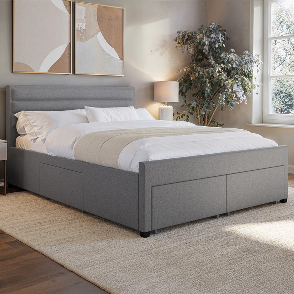 Introduce enhanced comfort and practicality to your bedroom with the Heybrook double bed frame. Upholstered in a luxurious grey linen fabric, this stylish bed features a deeply cushioned headboard for added comfort. The low foot end creates a sense of spaciousness, complemented by sleek black feet for a modern touch. This Heybrook fabric bed also features four convenient pull-out drawers – two at the foot and one on each side – providing ample storage for bedding and clothing.