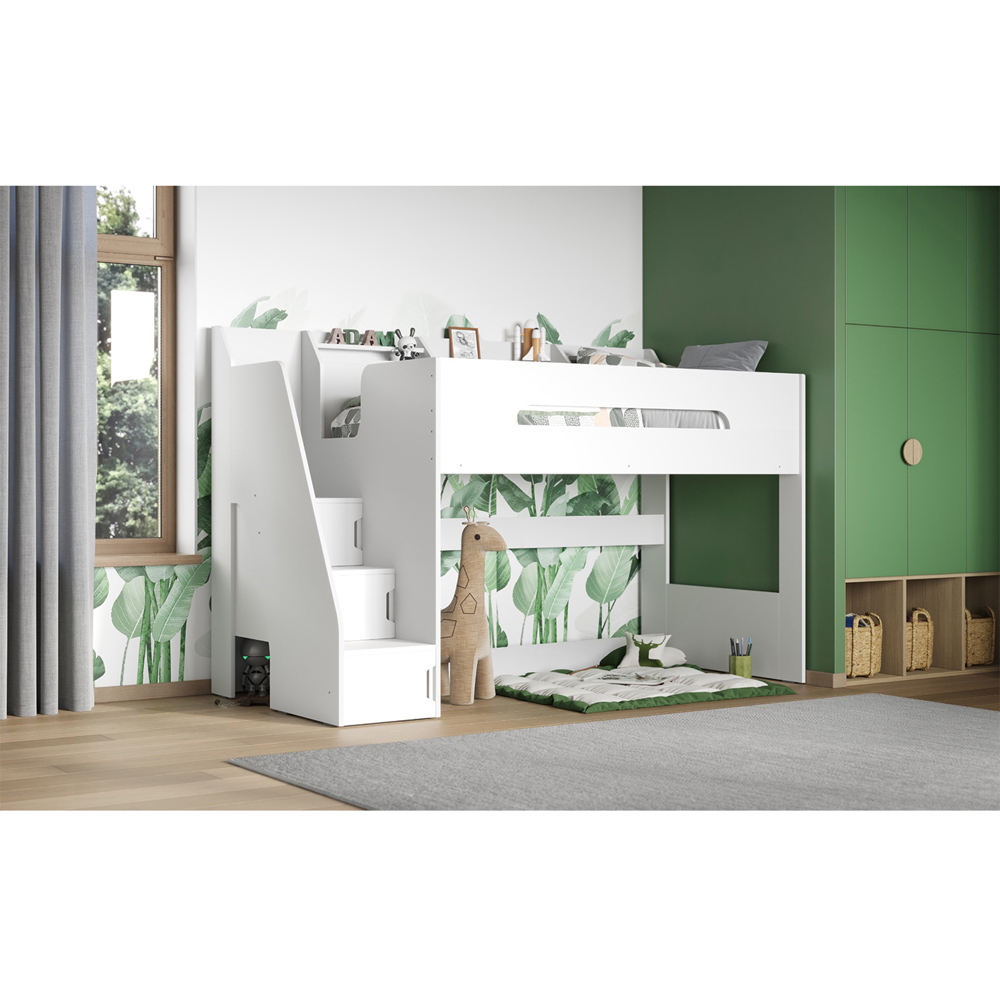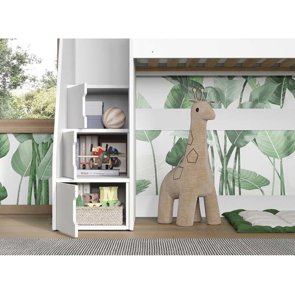 Maximise your child's bedroom space with the Stepaside White High Sleeper. Expertly crafted with your little one in mind, this high-sleeper frame features raised side panels, ensuring a secure and cosy night's sleep. The wide steps offer excellent stability when climbing up or down and cleverly integrate storage cabinets to maximise space for a clutter-free room. An expertly crafted shelf sits atop the frame, perfect for storing toys and small treasures. Please note: Frame only.