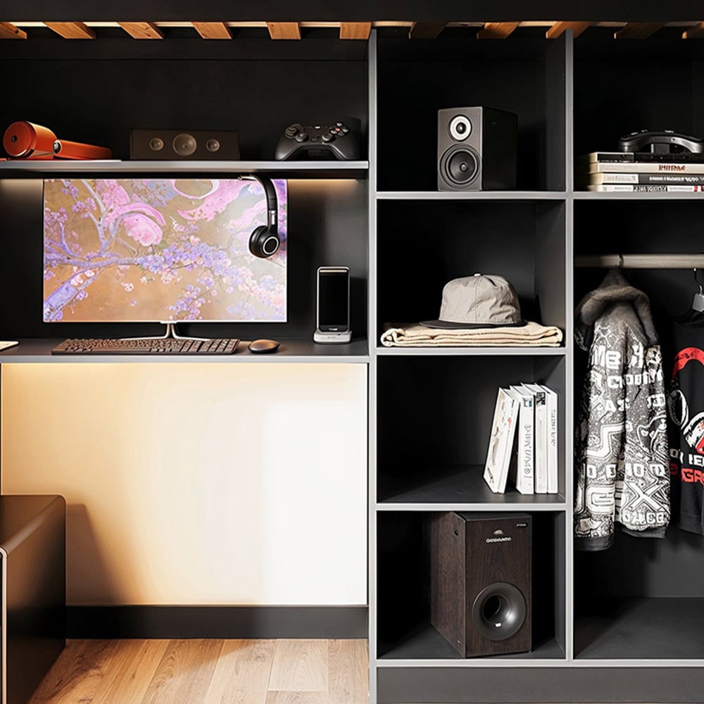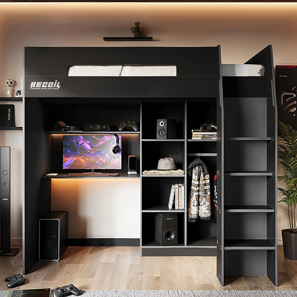 Maximise your space with the Recoil Summit Gaming High Sleeper, the ultimate solution for creating a dedicated gaming zone. This innovative high sleeper design combines a raised bed with an integrated workspace and storage, ideal for compact rooms. The built-in desk offers ample space for a monitor, console, and gaming accessories, crafting an immersive gaming environment. Multiple shelves, compartments, and a wardrobe section provide generous storage for games, equipment, and personal belongings, ensuring everything stays organised. Access the top bunk easily with the side ladder, while the high guardrails offer enhanced safety. Available in two stylish options: Black and Red, featuring striking red accents on the shelving and ladder for a dynamic look, and Black and Grey, a sleek, monochromatic design perfect for modern gaming spaces. Key features include the integrated desk and storage space for an efficient gaming setup, a sturdy ladder and high guardrails for safety, multiple shelves and a wardrobe section for storage, and a space-saving design perfect for smaller rooms. Available in black or black with red detailing.