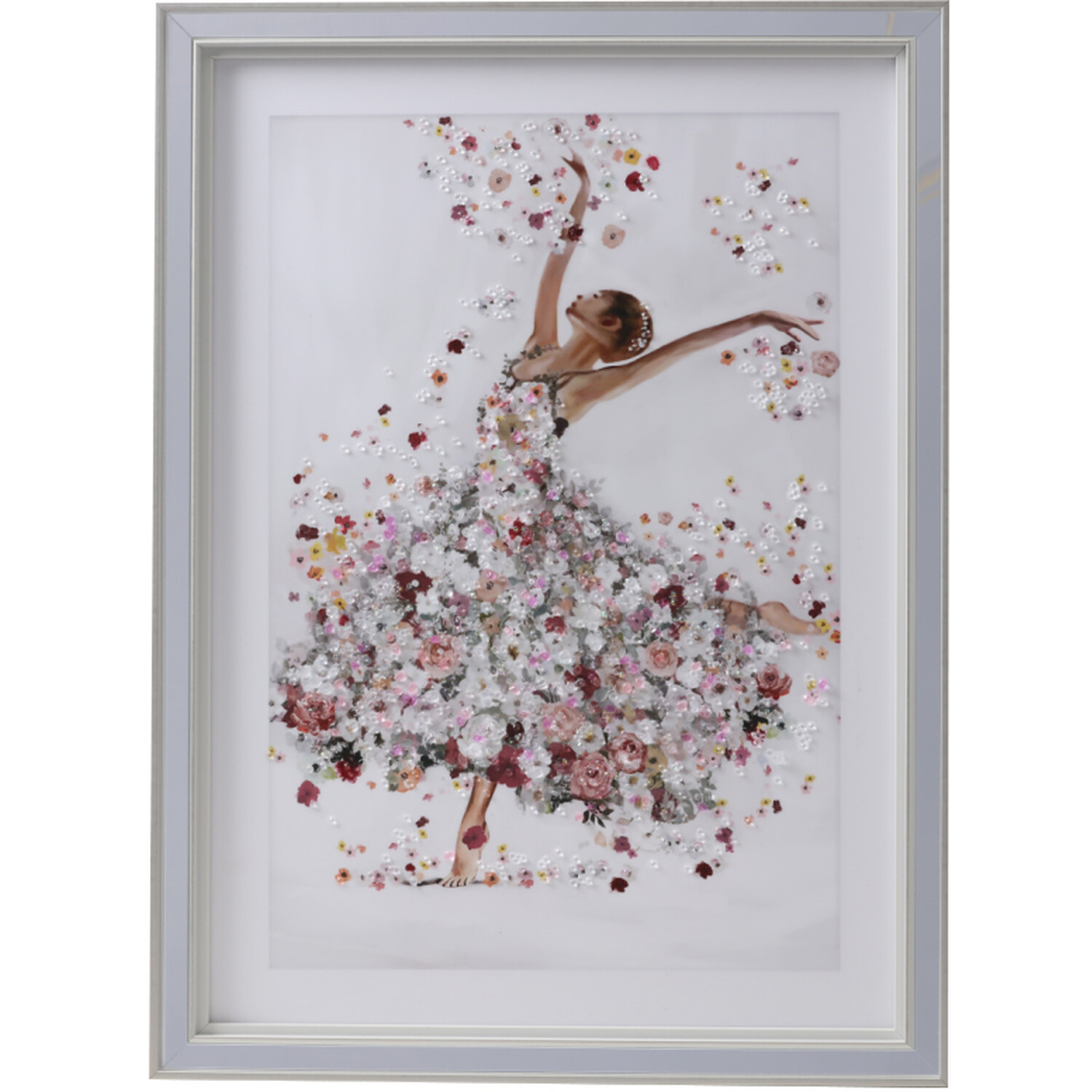 Add elegance and charm to your space with this Floral Ballerina Embellished Art. A captivating ballerina in mid-dance, her dress adorned with bright flowers, creates a sense of magical movement. Glass embellishments add a shimmering, three-dimensional effect, complemented by a coordinating silver frame. Easily hung with the included back hooks, this piece provides the perfect finishing touch to any room.