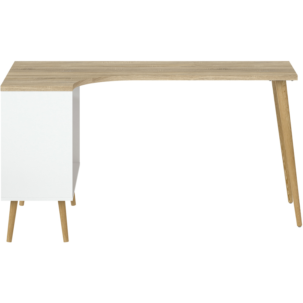Elevate your home workspace with the Florence desk: a stylish blend of white and oak. This elegant piece features a smooth work surface perfect for laptops or PCs, complemented by two smoothly gliding drawers – handle-less for a clean aesthetic – and three open shelves offering ample storage. Crafted from high-quality laminated board for durability and resistance to scratches, moisture, and temperature fluctuations, its sturdy tapered legs ensure stability. The Florence is equally at home in contemporary or traditional settings.