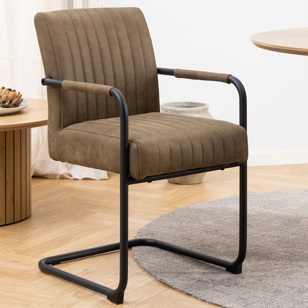 This retro-style dining chair adds vintage charm and modern comfort to your dining room. The light brown microfiber fabric, specially coated for a rustic look, is complemented by a sturdy black swing metal base. Enjoy lasting comfort thanks to the pocket springs in the seat - perfect for those long after-dinner chats.