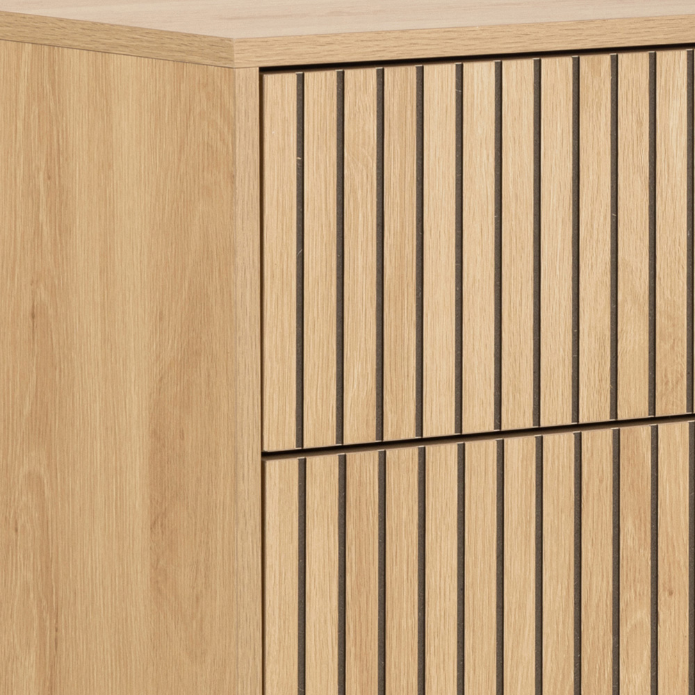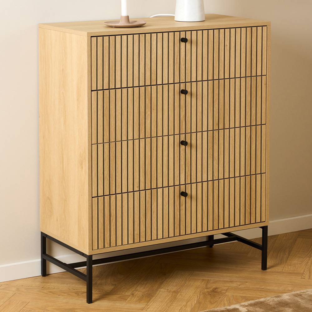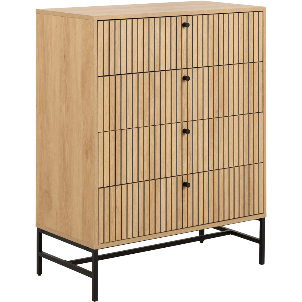 This Albany chest boasts a contemporary design, effortlessly blending natural oak rough melamine across its top, frame, and four drawers. The distinctive lamella drawer fronts add a textured, modern feel. A geometric base of matte black powder-coated steel provides a sleek industrial contrast. Measuring 80.6 x 40 x 100.1cm, it offers generous storage, making a stylish statement in any modern home.