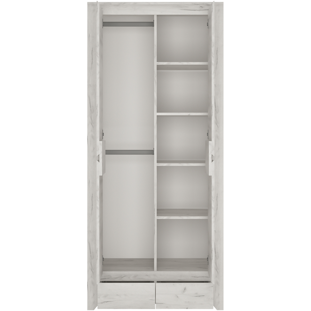 This stylish bedroom collection, perfect for any age, boasts a contemporary design in a crisp white, crafted oak melamine finish. The set includes a bedside cabinet with one drawer, a five-drawer chest, and a wardrobe with two doors and two drawers. Dimensions are as follows: Bedside cabinet: W 49.1cm x H 37.6cm x D 40cm, Chest of drawers: W 84cm x H 76.5cm x D 40cm, Wardrobe: W 147.2cm x H 200.1cm x D 58.1cm.