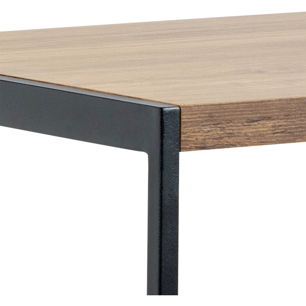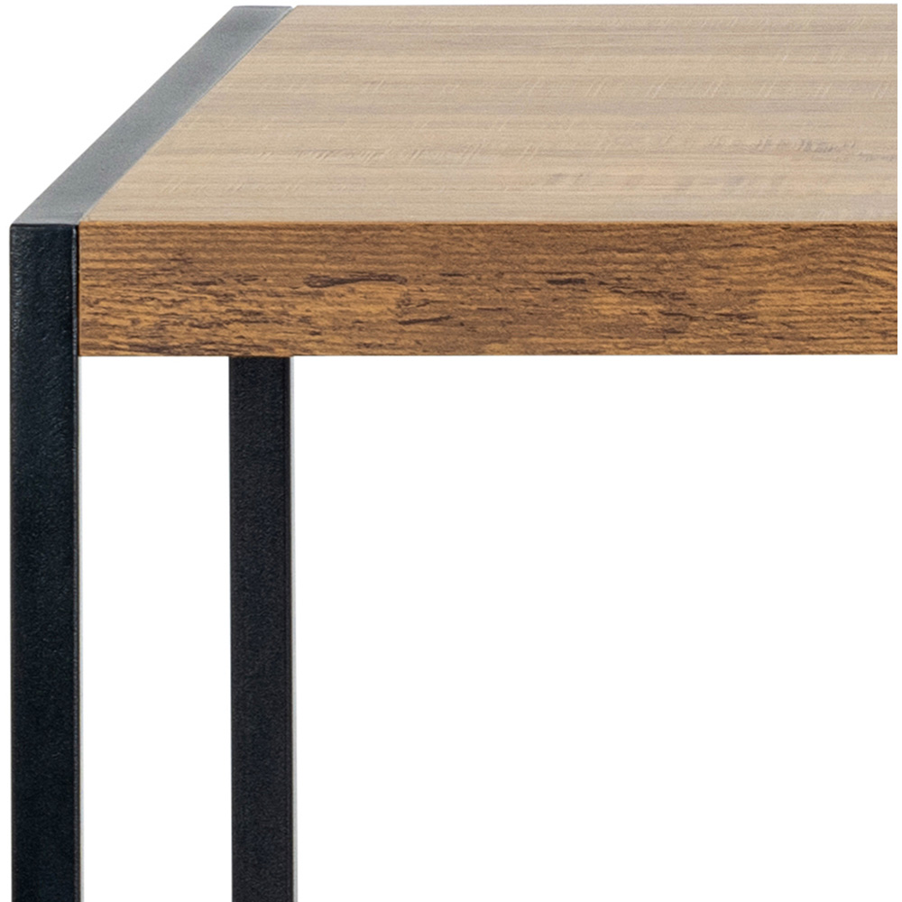 This bar table set brings rustic charm and modern style to your dining area. A robust black steel base supports a beautiful rustic oak melamine top, complemented by a comfortable footrest, bench, and two stools. Perfect for sophisticated entertaining.