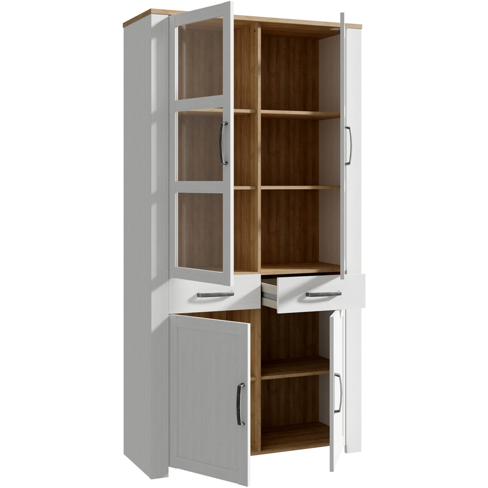 The Bohol Display Cabinet: a stunning statement piece for your home. This elegant cabinet boasts a Provençal design, beautifully finished in Riviera oak and Sibiu light larch. Four doors and a two drawers offer ample storage, while integrated LED lighting showcases your cherished possessions. The soft-closing system ensures quiet, effortless operation, adding to its refined appeal. A timeless addition to any room, it effortlessly blends classic style with modern convenience.