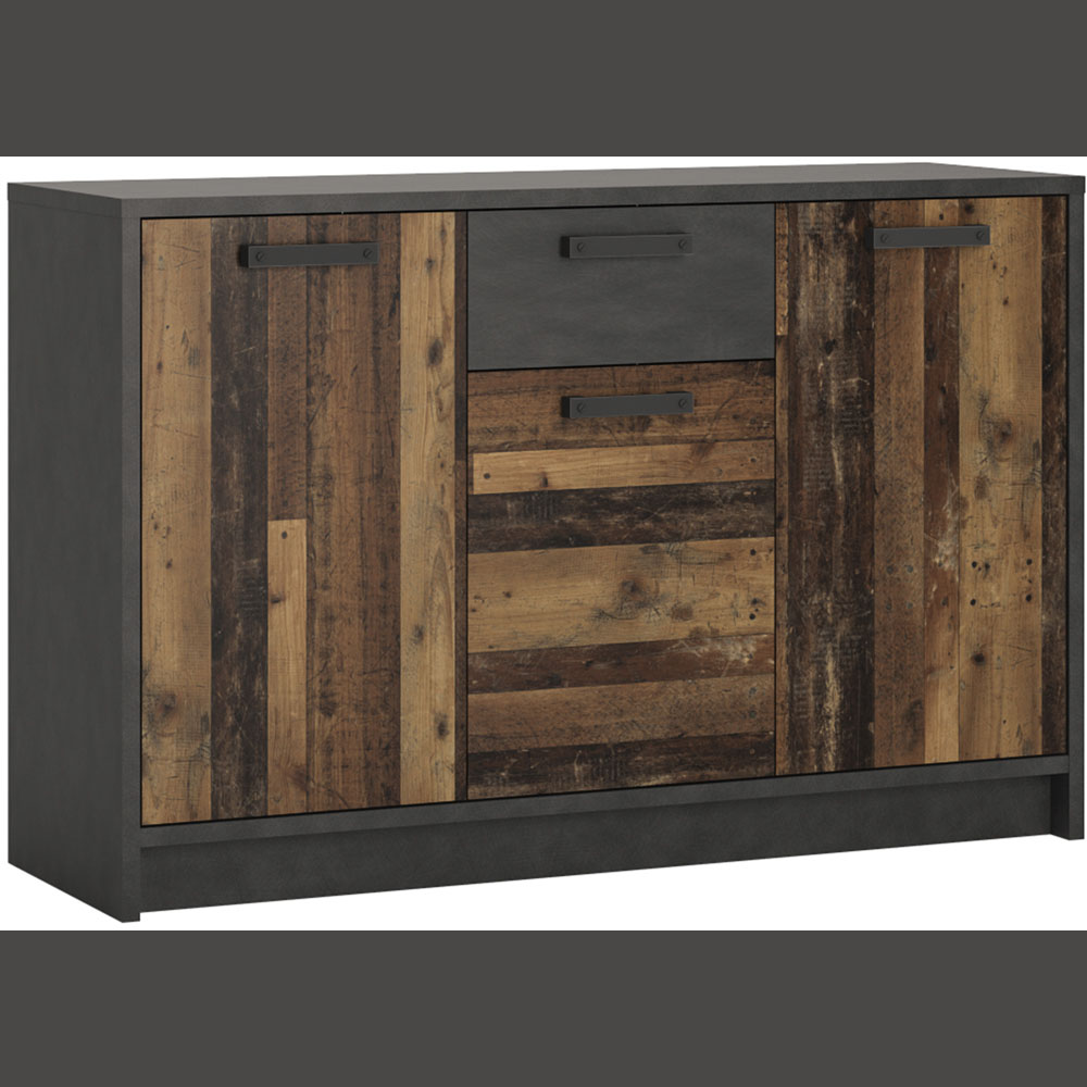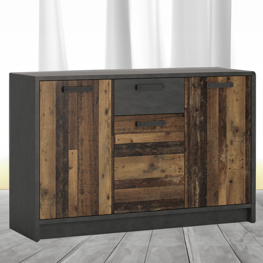 Enhance your home',s aesthetic with the Brooklyn Walnut and Dark Matera Grey Cabinet. This industrial-style storage solution boasts ample space and a design that complements diverse interiors. Crafted from durable, scratch, damage, moisture, and heat-resistant laminated chipboard, this cabinet offers practicality and style. Its three doors and single drawer provide convenient storage, while uniquely designed handles ensure easy access. A charming addition to any room.