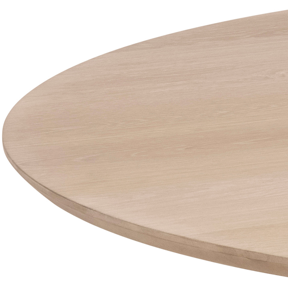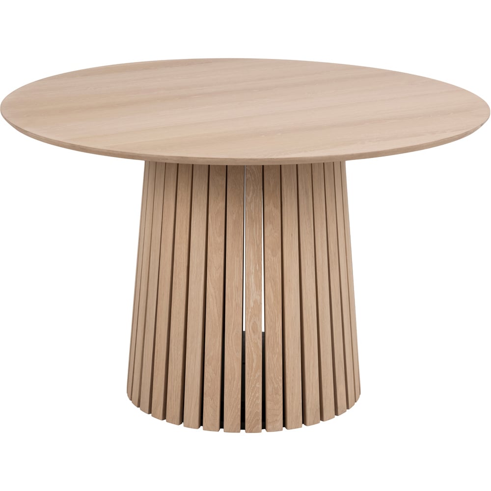 This round dining table brings minimalist style to your dining room. Its top, crafted from white pigmented oiled oak veneer, boasts a subtle lamella design for a touch of understated elegance. Supported by a pillar base, this piece is a sophisticated centrepiece for any dining area.