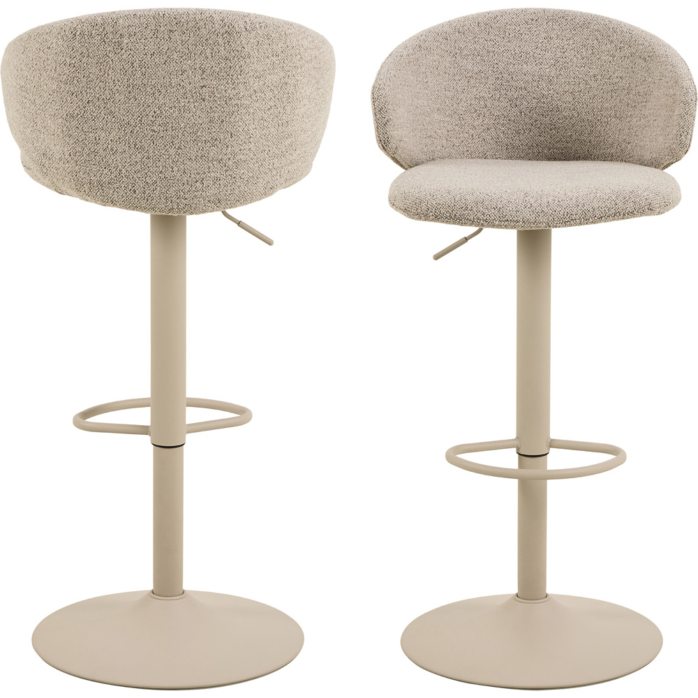 Elevate your bar or counter with the Ella bar stool duo. These stylish stools boast plush, beige bouclé-like Monza fabric upholstery for a comfortable and sophisticated feel. Effortlessly adjust the height with the integrated gas lift and swivel function, aided by a handy adjustment handle. The sturdy trumpet base, finished in sleek grey rough powder-coated steel, ensures lasting support and a contemporary aesthetic. Perfect for homes and offices alike, this pair offers both practicality and style.