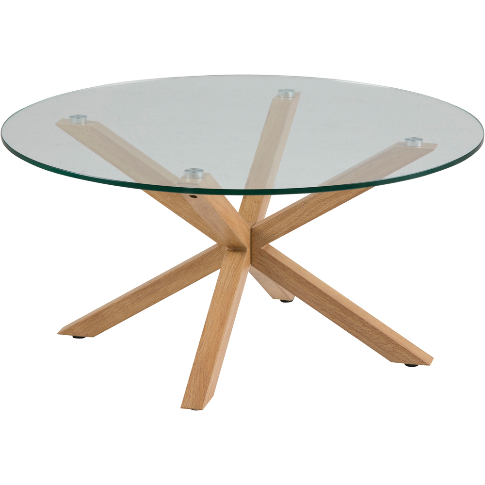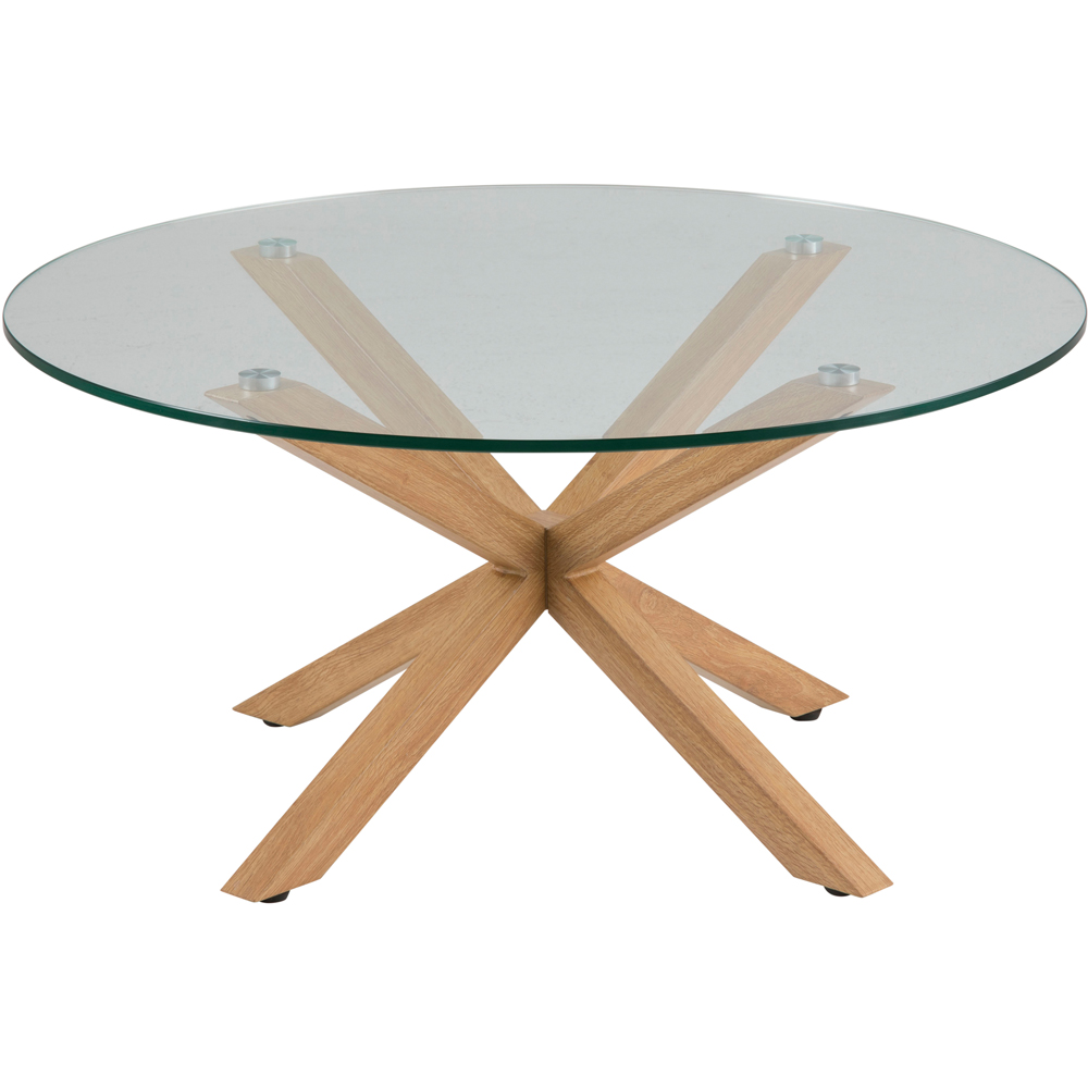 Elevate your living space with this stylish round coffee table. Its clear tempered glass top offers a pristine, modern look, perfectly complemented by the contemporary oak foil cross base. This chic piece is the ideal addition to any stylish home.