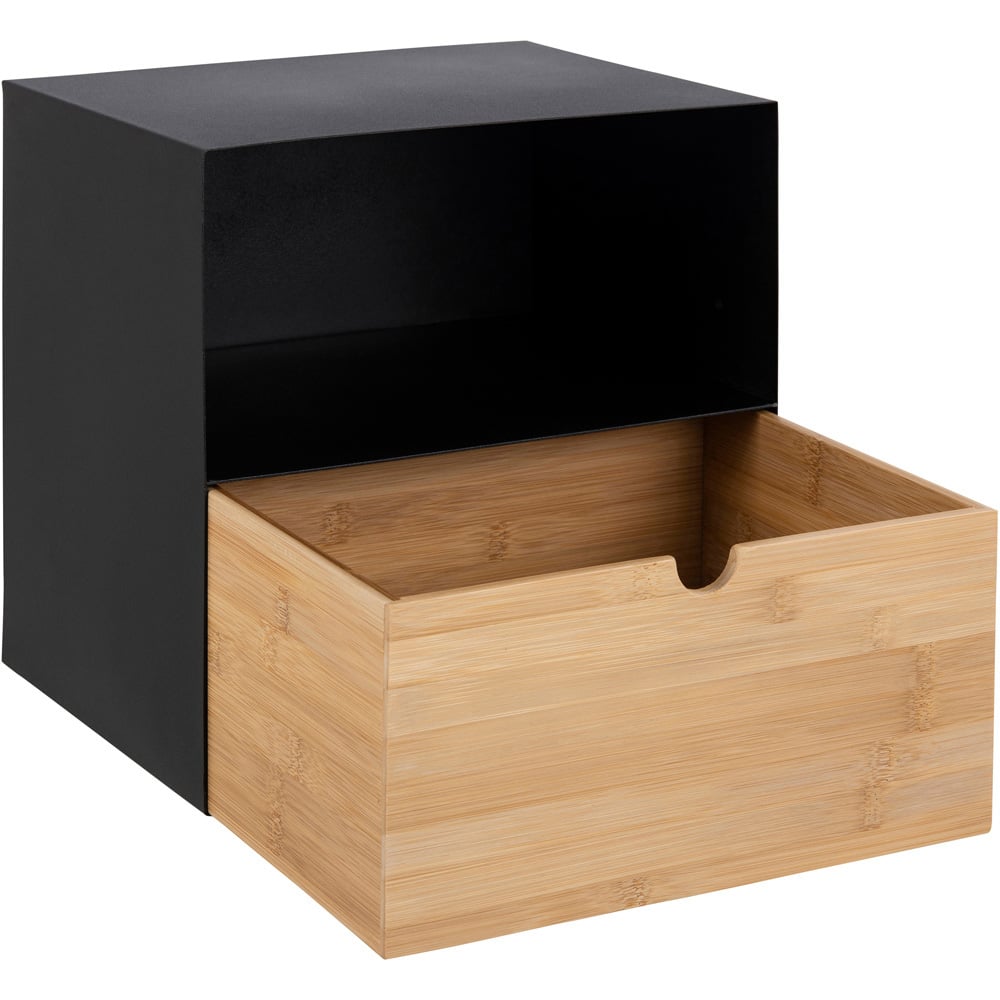This stylish wall-mounted unit blends bamboo and metal for a minimalist look. Perfect for bedroom or hallway, it offers a bamboo drawer for storage and a metal shelf for display. The modern, timeless design complements any décor.