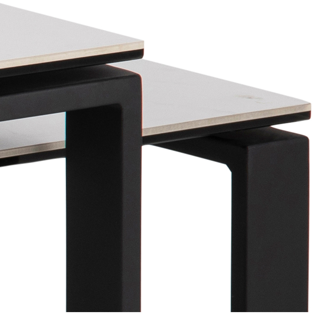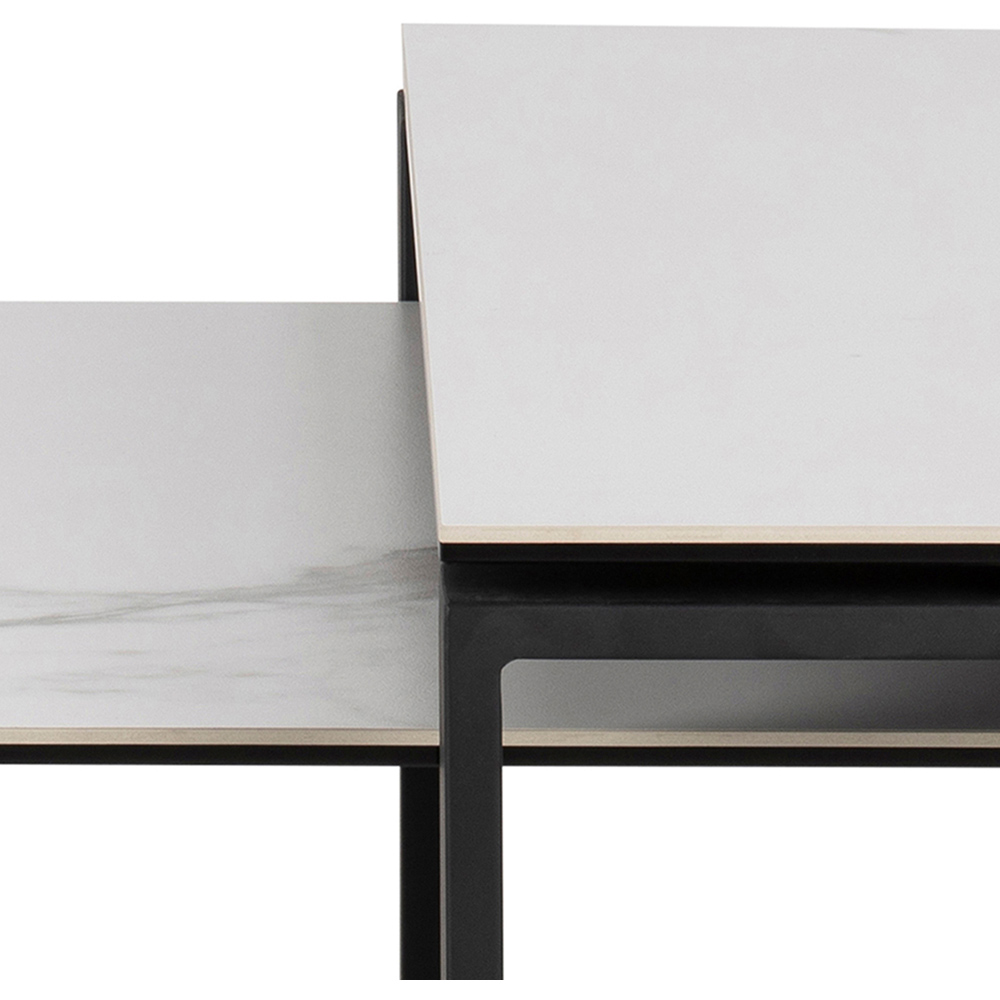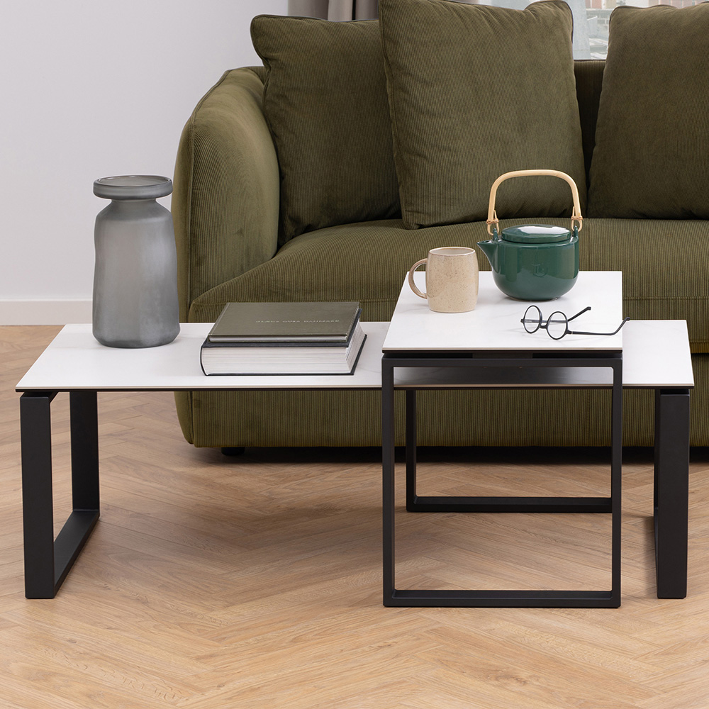 This coffee table set brings a touch of contemporary chic to your home. The table boasts a striking white rough ceramic top, complemented by a sleek matte black powder-coated steel sledge base. This robust base ensures both stability and a modern aesthetic, creating a cohesive and stylish look.