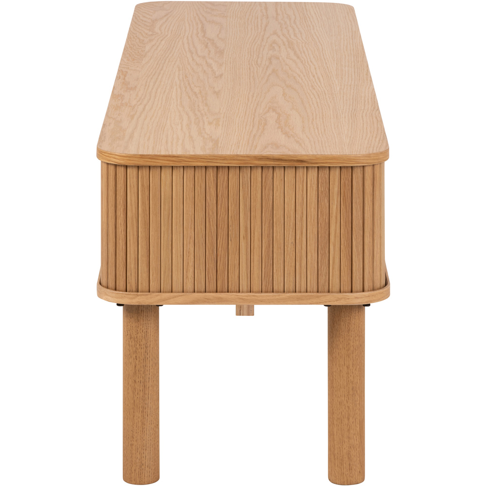 Elevate your living space with this stylish TV unit, offering a sophisticated storage solution in a sleek oak effect. Its unique lamella design and practical sliding and tambour doors create a contemporary feel, perfect for the modern home.