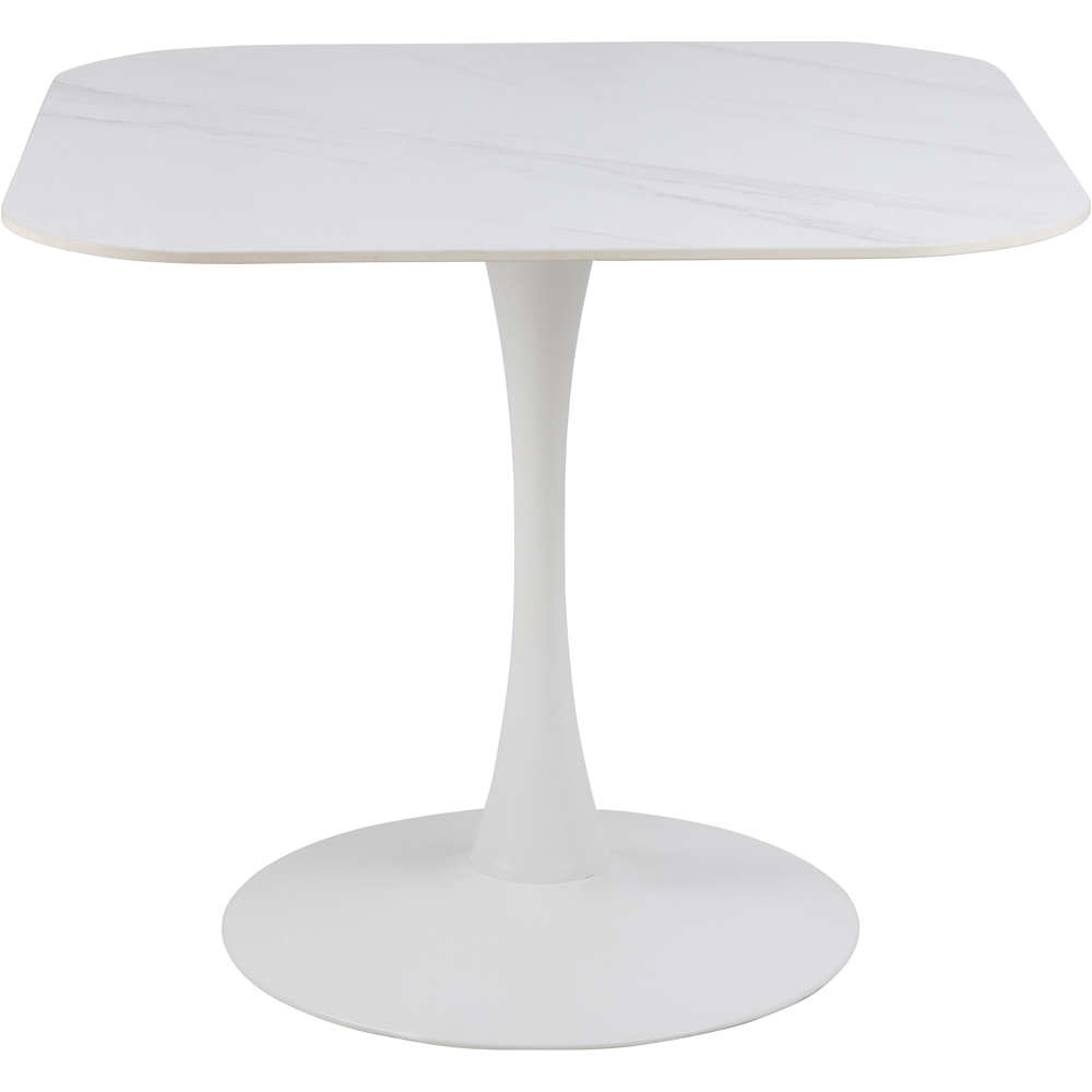 This stunning dining table commands attention. Its pristine white ceramic top is perfectly complemented by a striking trumpet-shaped steel base, designed to be the centrepiece of any dining area.