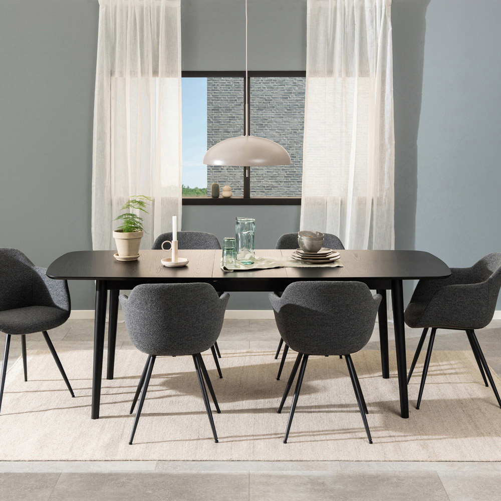 A sophisticated rectangular dining table, boasting softened edges and a sleek black oak finish. The lacquered oak veneer tabletop effortlessly expands with a simple butterfly extension mechanism.