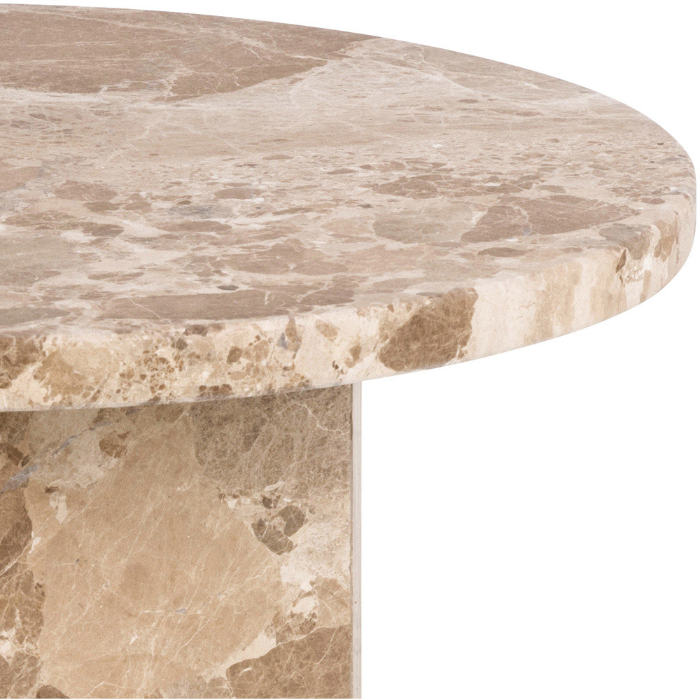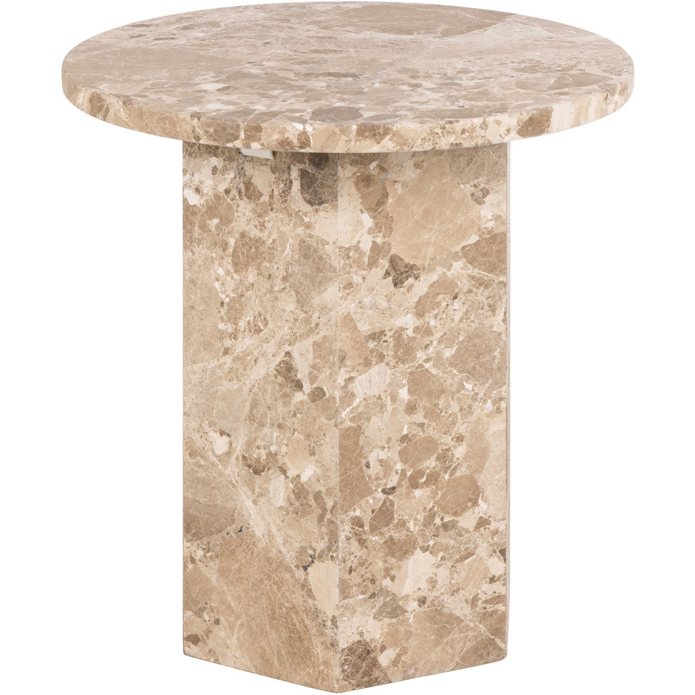 This striking side table makes a statement with its clean lines and unique stone variations. A round tabletop sits elegantly atop a hexagonal pillar base, adding drama and sophistication to any interior.