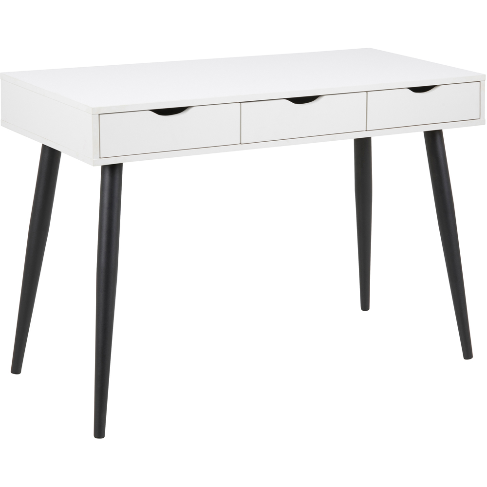 A stylish and functional addition to any workspace, this rectangular desk boasts a sleek white top and three convenient drawers. Its base, crafted from matt black, powder-coated steel, adds a touch of modern sophistication. Durable metal runners ensure smooth operation and lasting quality, effortlessly blending style and practicality.