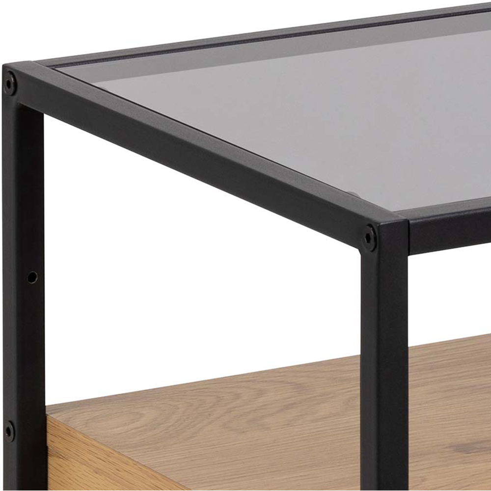 A sophisticated bedside table, seamlessly blending style and practicality. The sleek tabletop, crafted from smoked tempered glass, rests elegantly upon a robust matt black powder-coated steel base. Below, a drawer and shelf, both fashioned from ash black melamine, offer ample storage. An additional open compartment provides even more space for your bedside essentials. This piece adds a touch of modern elegance to any bedroom.