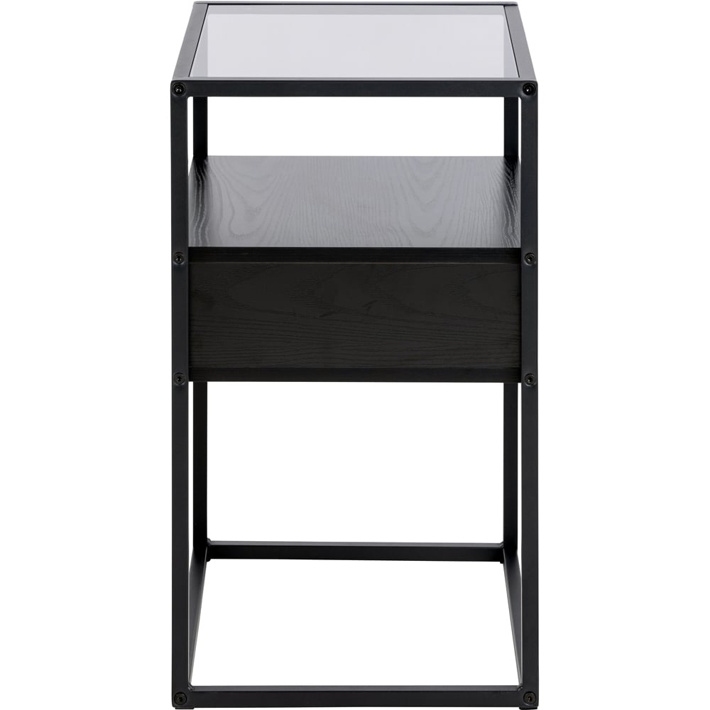 A sophisticated bedside table, seamlessly blending style and practicality. The sleek tabletop is crafted from smoked tempered glass, offering a touch of modern elegance. Below, a drawer and shelf, both fashioned from ash black melamine, provide ample storage for bedside essentials. A matt black, powder-coated steel base completes the look, adding a robust and industrial feel. An open compartment offers further space for smaller items. This piece makes a stylish and functional addition to any bedroom.