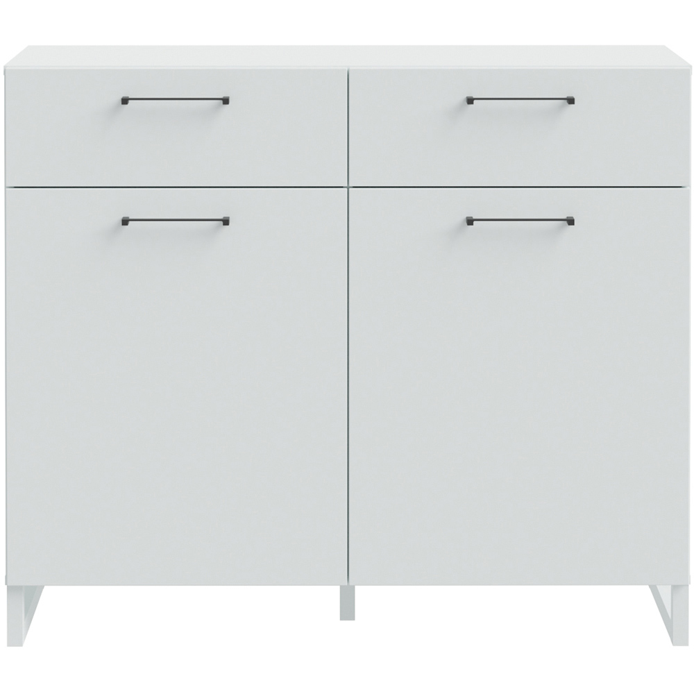 The Sali two-door, two-drawer chest in light grey offers a contemporary aesthetic for your home. Its sleek design is complemented by robust black metal handles and durable ABS edging, ensuring both style and longevity. The integrated soft-closing system adds a touch of refined convenience.