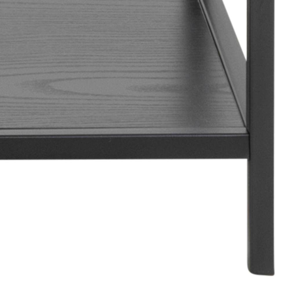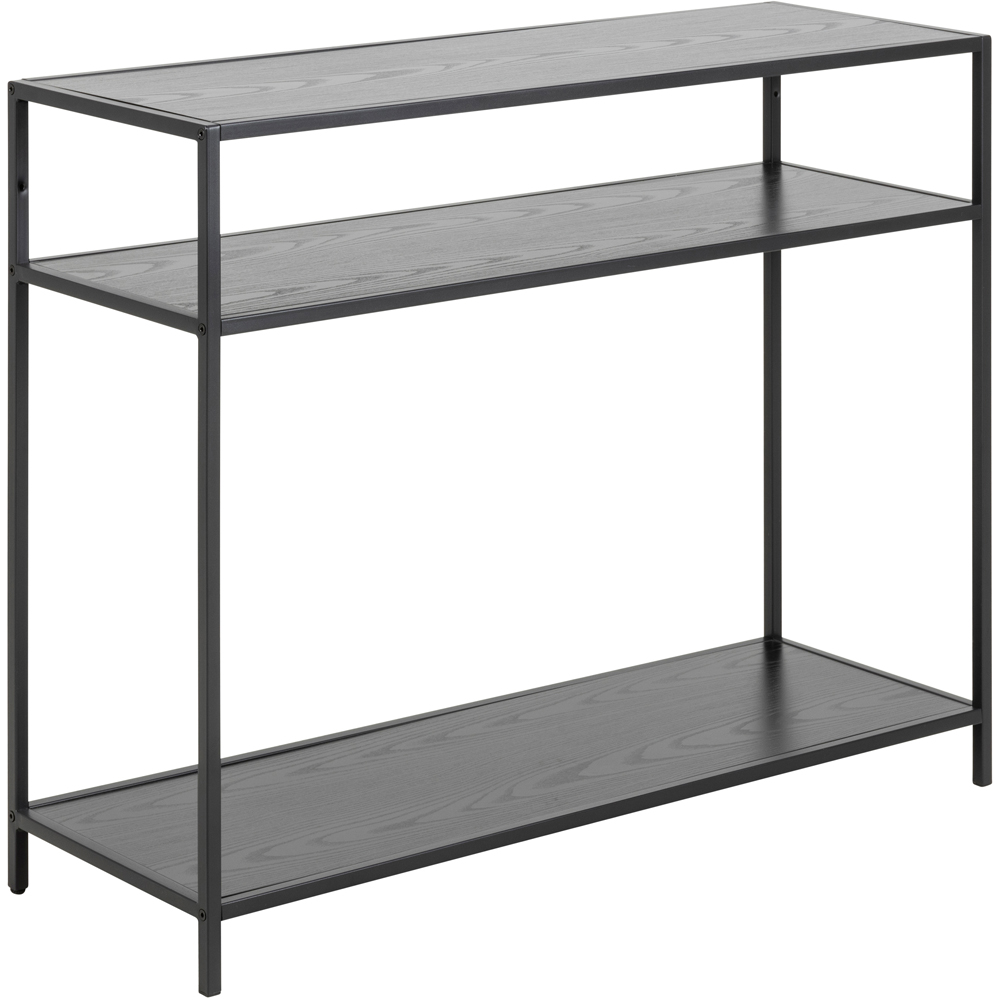 This stylish console table is perfect for any modern home. Its sleek matte black steel base and two ash black shelves offer both style and functionality. A versatile piece ideal for contemporary settings.