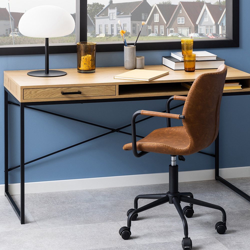 This stylish rectangular desk will transform your workspace. A matte wild oak effect finish and a practical drawer and shelf provide ample storage. The sleek matte black steel sledge base features an open compartment and wire hole for easy cable management, blending functionality with modern design.
