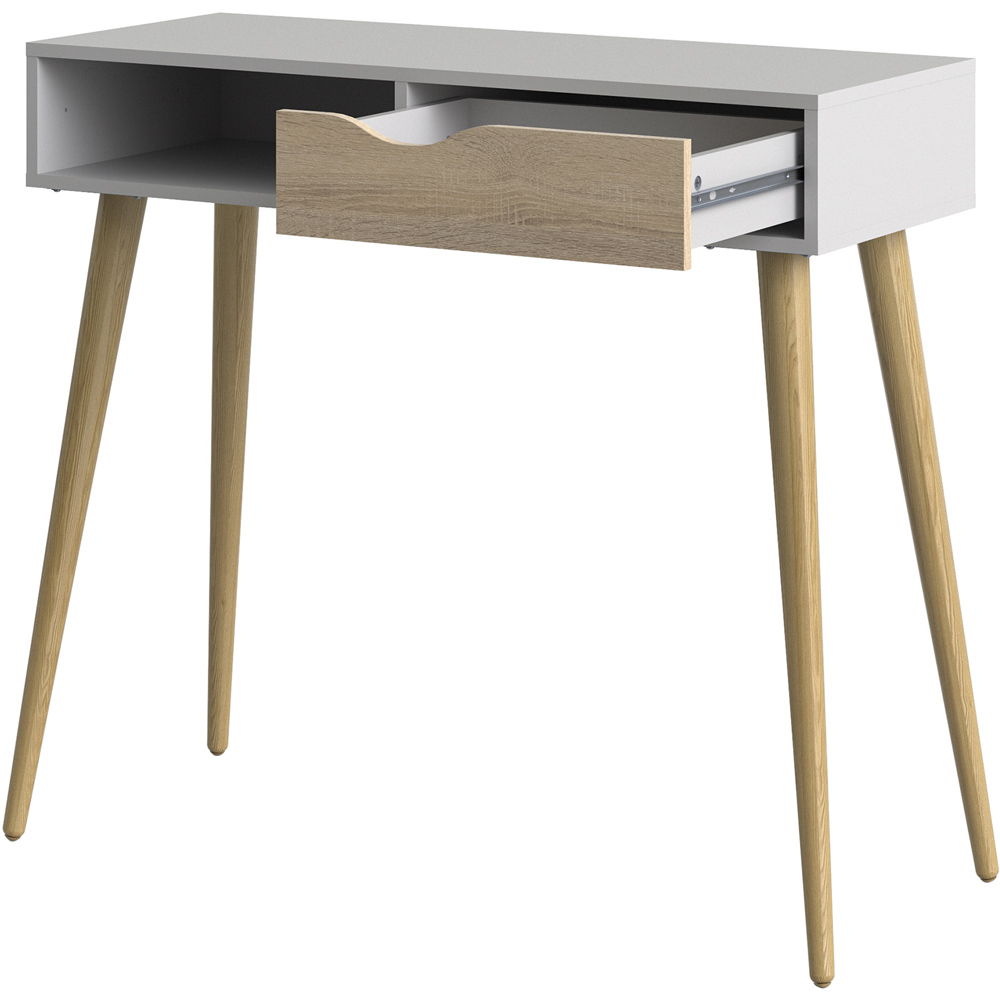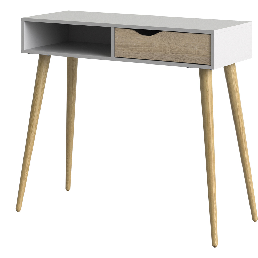 Elevate your home',s aesthetic with the Florence console table. This stylish piece boasts a smooth tabletop, perfect for showcasing cherished books or decorative objects. A single drawer, effortlessly gliding on smooth runners, and a handle-less design add a touch of modern minimalism. Below, an open shelf provides additional storage. Constructed from high-quality laminated board for exceptional durability and resistance to scratches, moisture, and high temperatures, it’s built to last. Supported by sturdy tapered legs, this console table offers both stability and a sophisticated silhouette, complementing contemporary and traditional interiors alike. The table is white and oak.