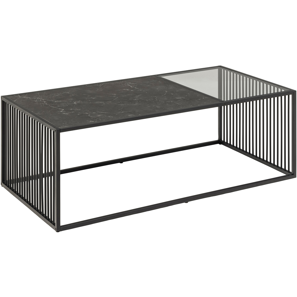 This rectangular coffee table makes a stunning addition to any living room. Its sophisticated design combines a rough matt black top with smoked tempered glass, creating a striking contrast. The matte black steel wire base adds an industrial-chic touch, completing the look.